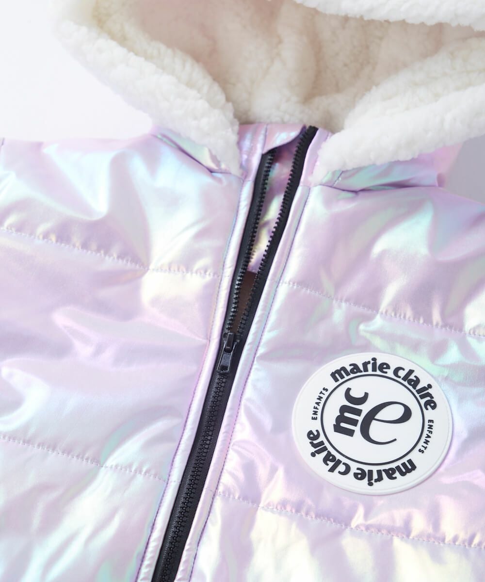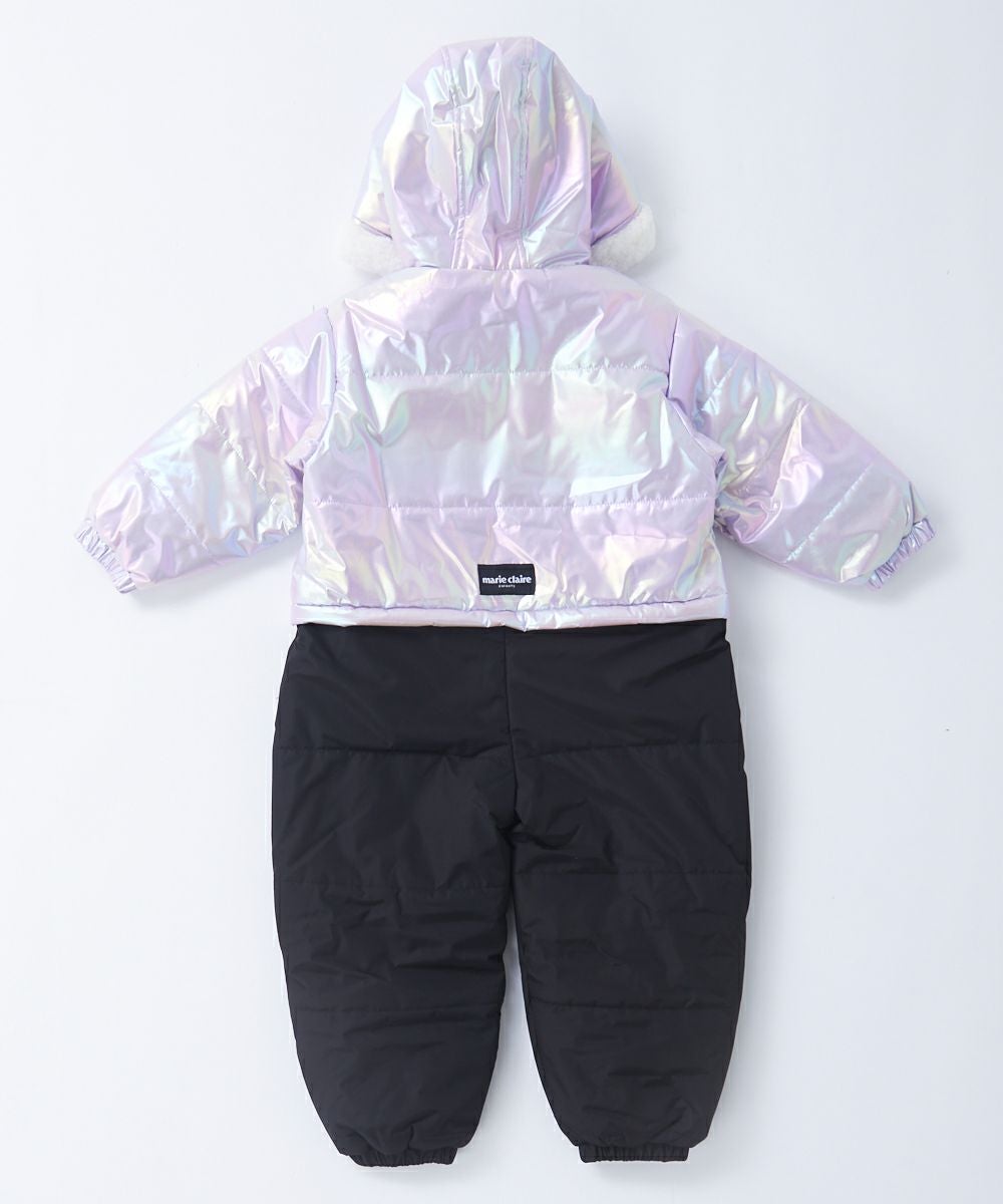 光の加減で色合いが変わるオーロラカラーが目を引くジャンプスーツ。冬遊びに最適な中綿入りのジャンプスー ツは膝下までのファスナー付きで着脱しやすい設計。袖部分の裏地は出し入れがスムーズなポリエステル素材、 袖以外は肌触りの良いフリース素材で暖かい仕様になっています。