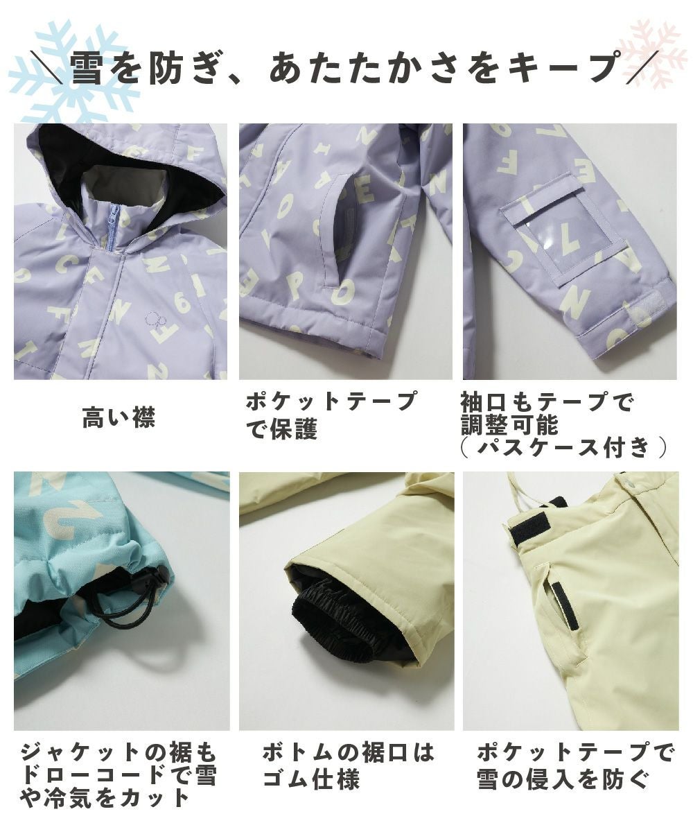 ジャケット&パンツのスキー・スノーボードウェア上下セットです。スノボーやスキー、雪遊びなどウインタースポーツで大活躍!サスペンダーで調整可能なので、成長に合わせて長く着られます。左袖には便利なパスケース付き。お子様が安心して着用できる、ママもうれしい機能付き!