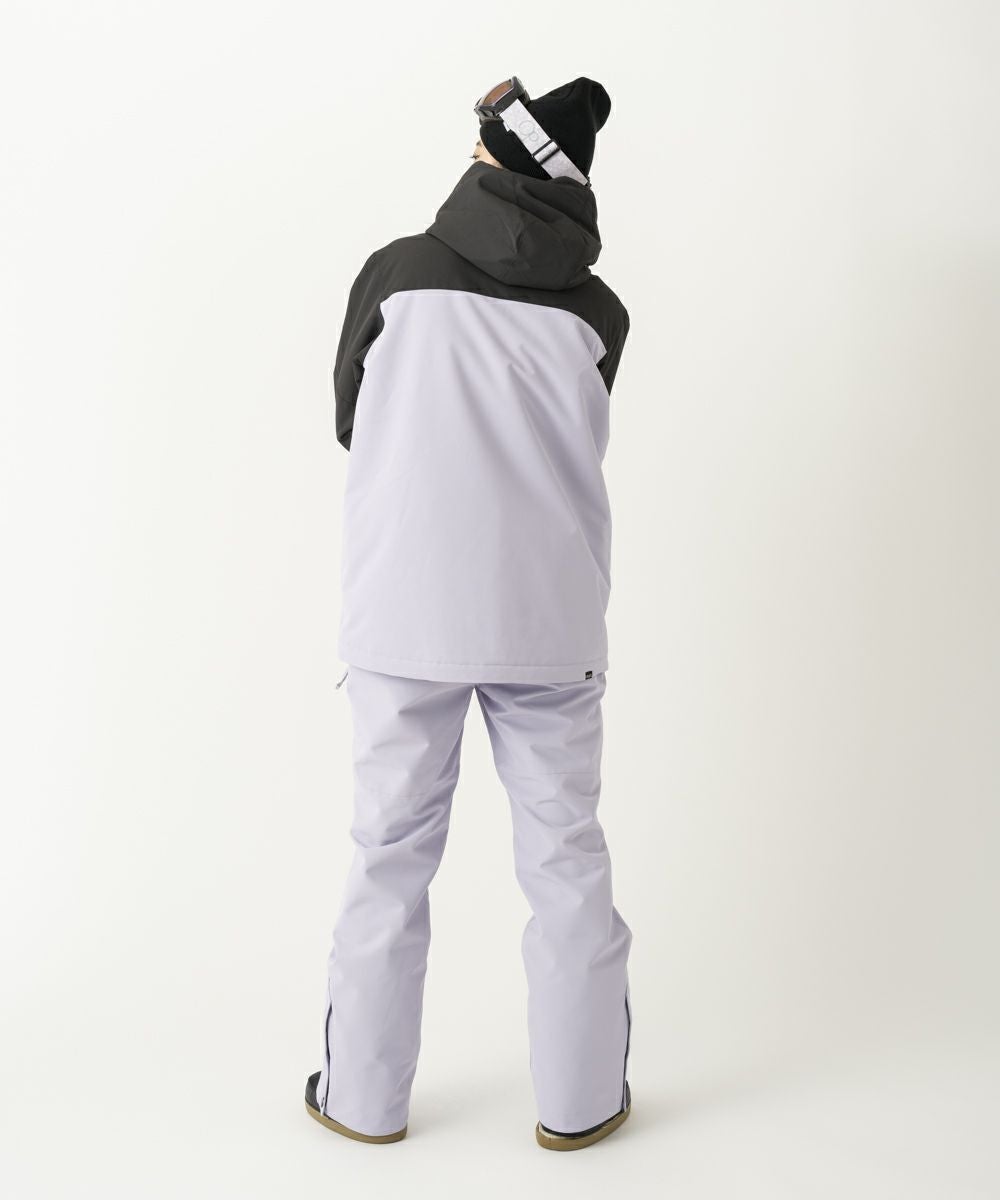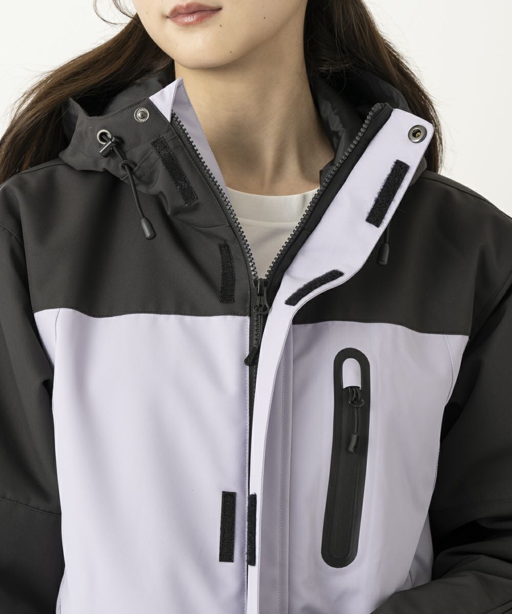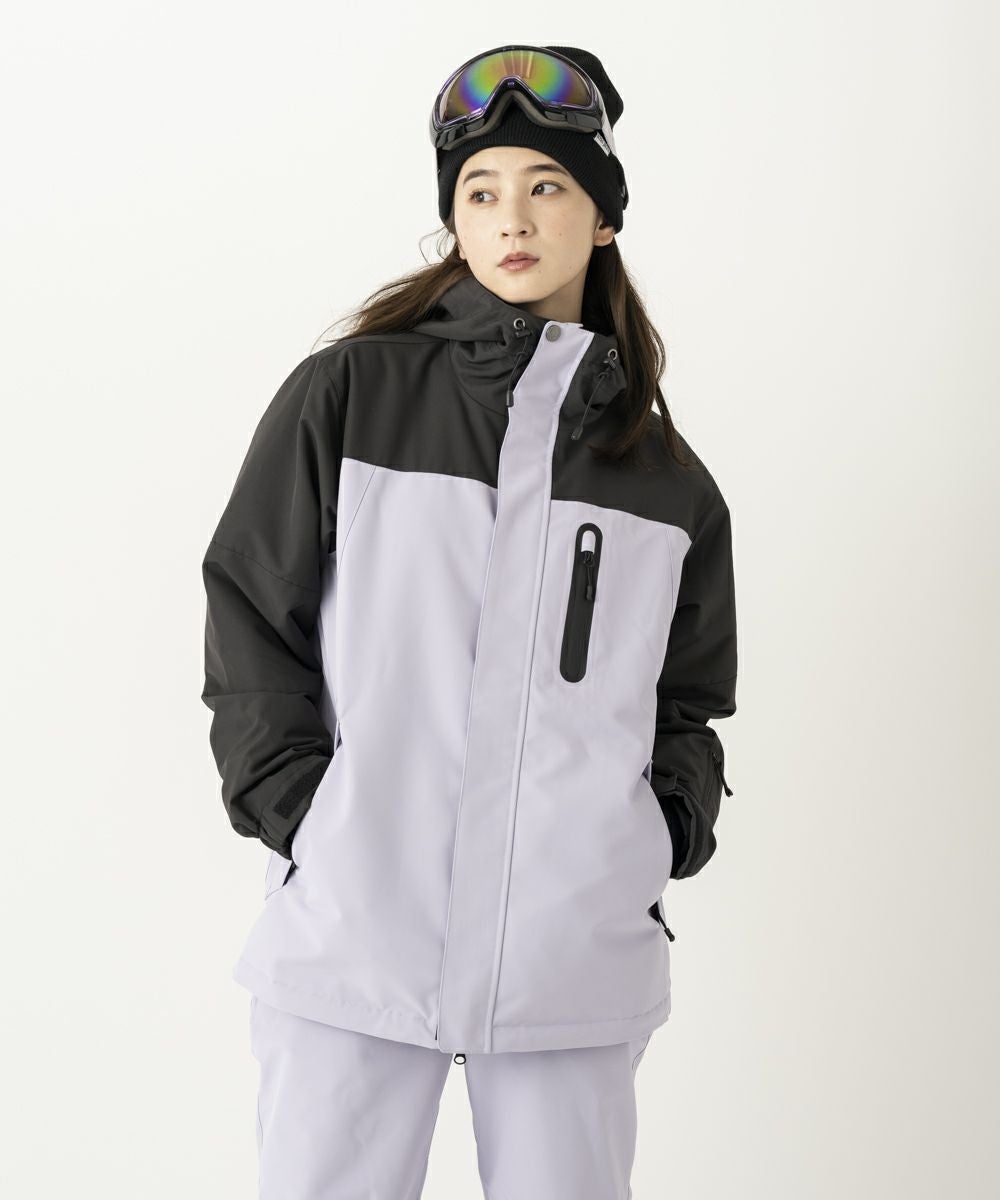 トレンドのワイドシルエットとバイカラーデザインが目を引く中綿入りスノーウェア。
