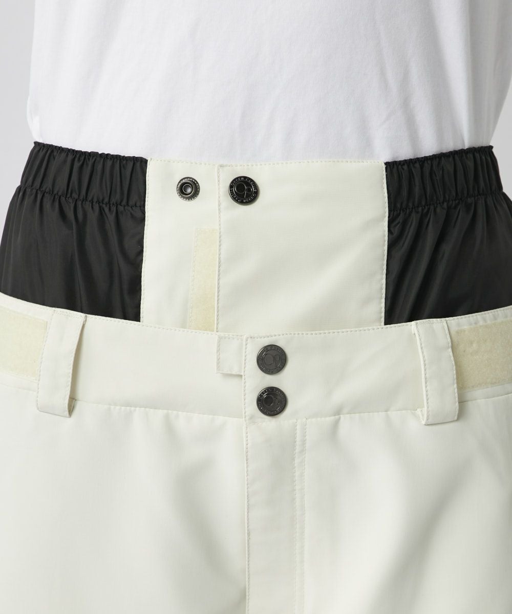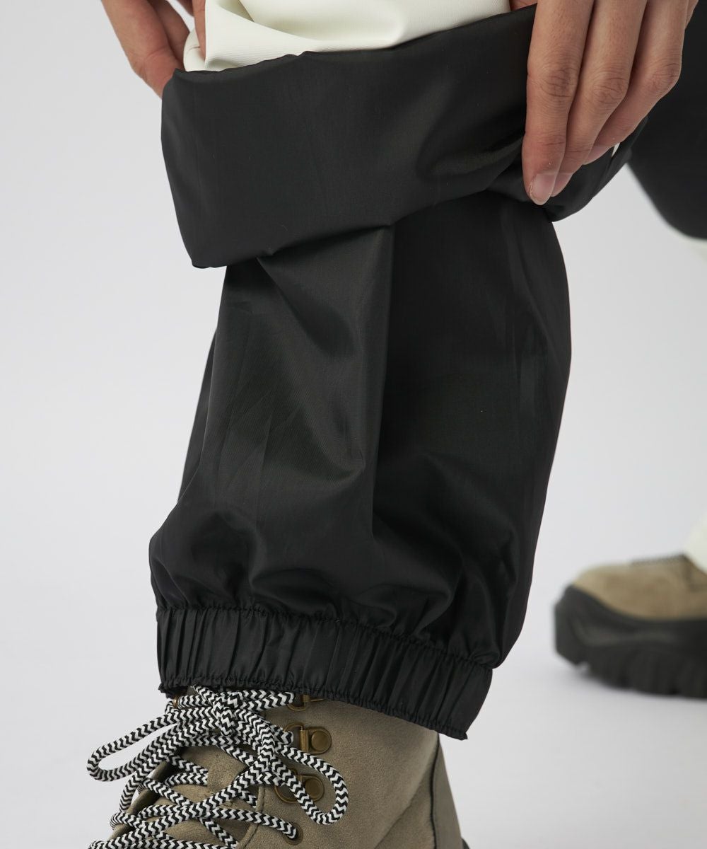 程よいワイドシルエットで、ニュアンスカラーのベースと膝、お尻、裾後ろを黒で切り替えしたシンプルなデザインです。同じカラーのジャケットを合わせてセットアップがお勧めです。