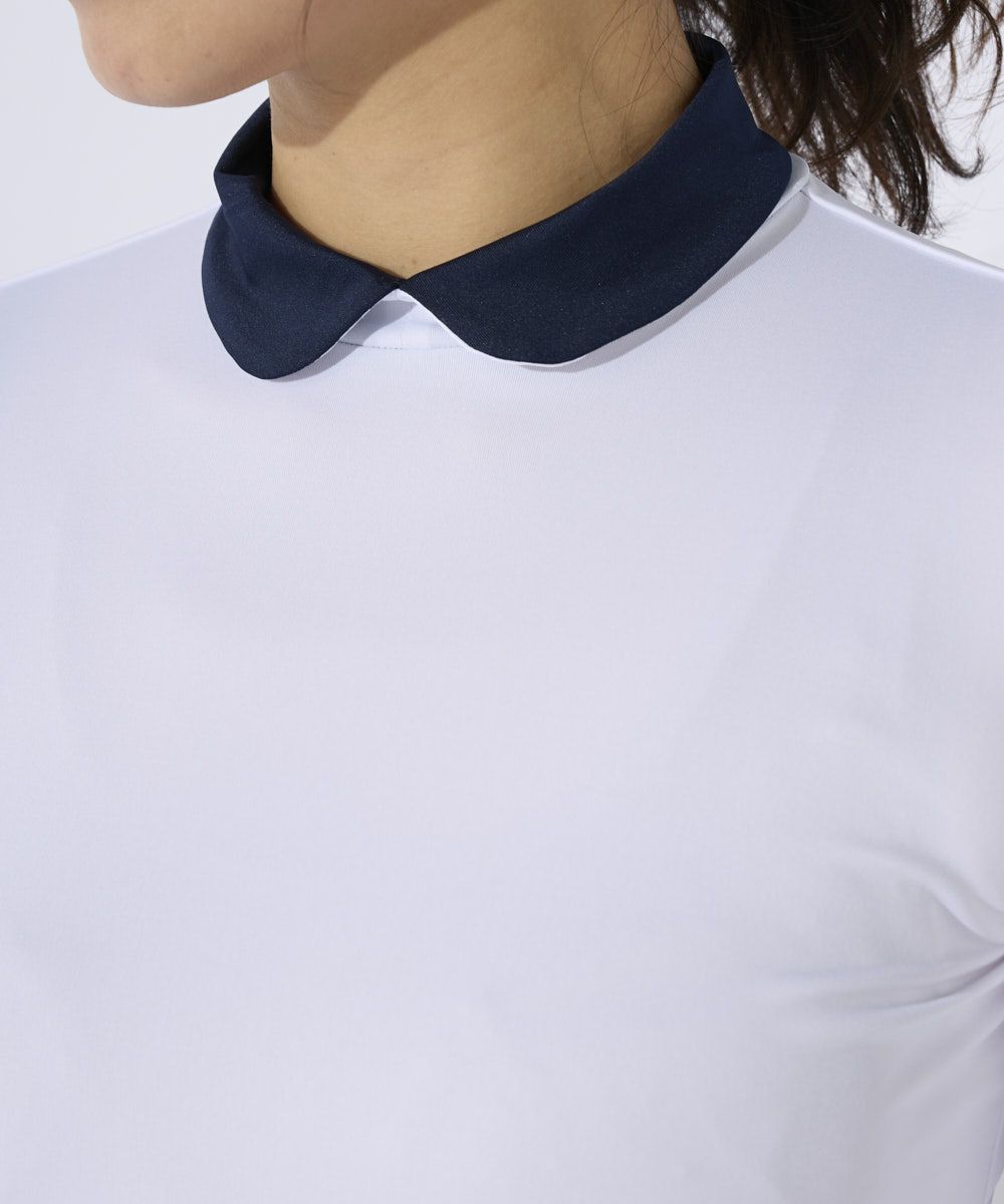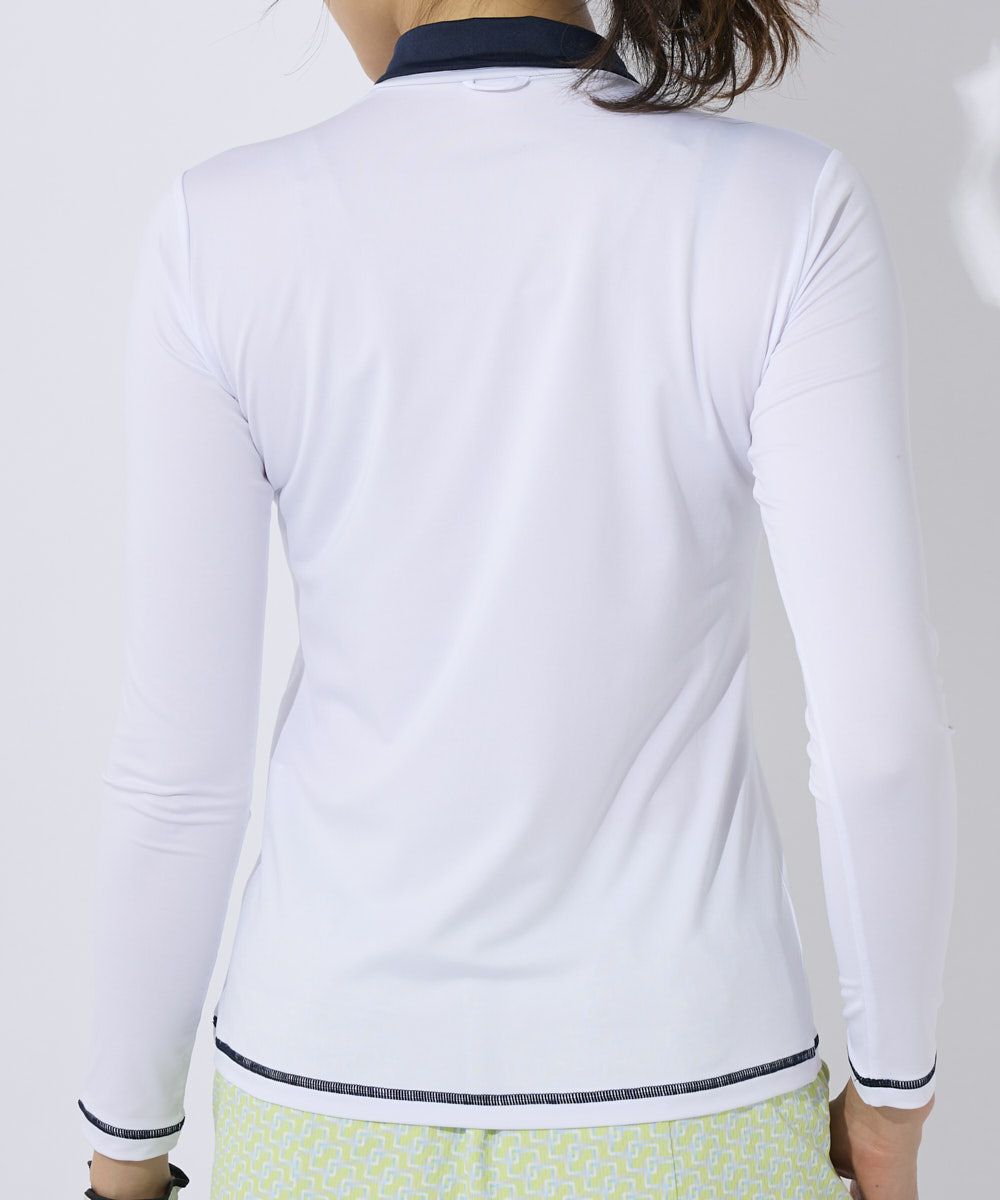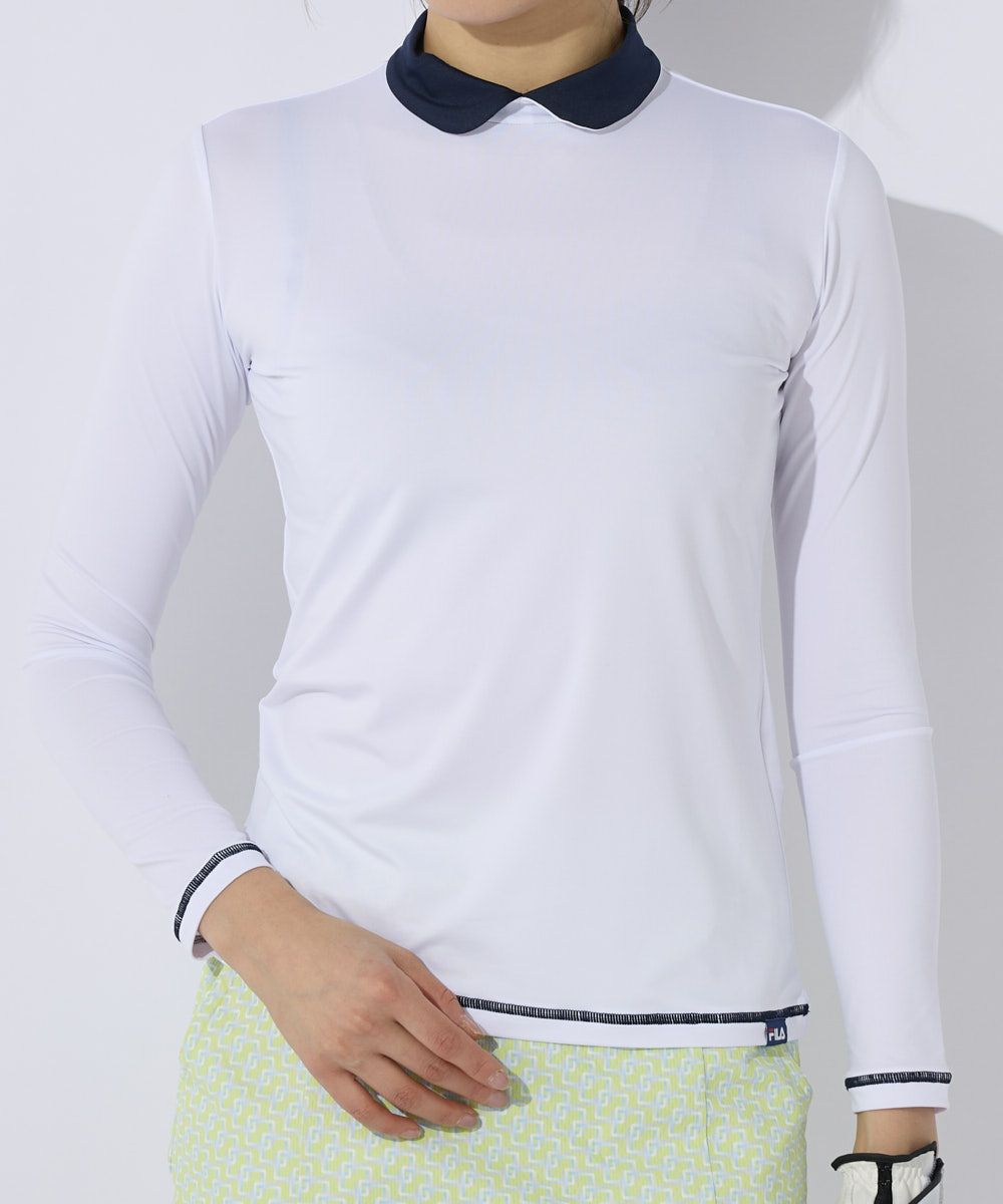 TシャツにはFILAロゴをランダムにジャガードで表現した、ストレッチ性の良い素材を使用。インナーの衿はハイネックとしてもしくは折り返してシャツ衿にもできる2WAYタイプです。