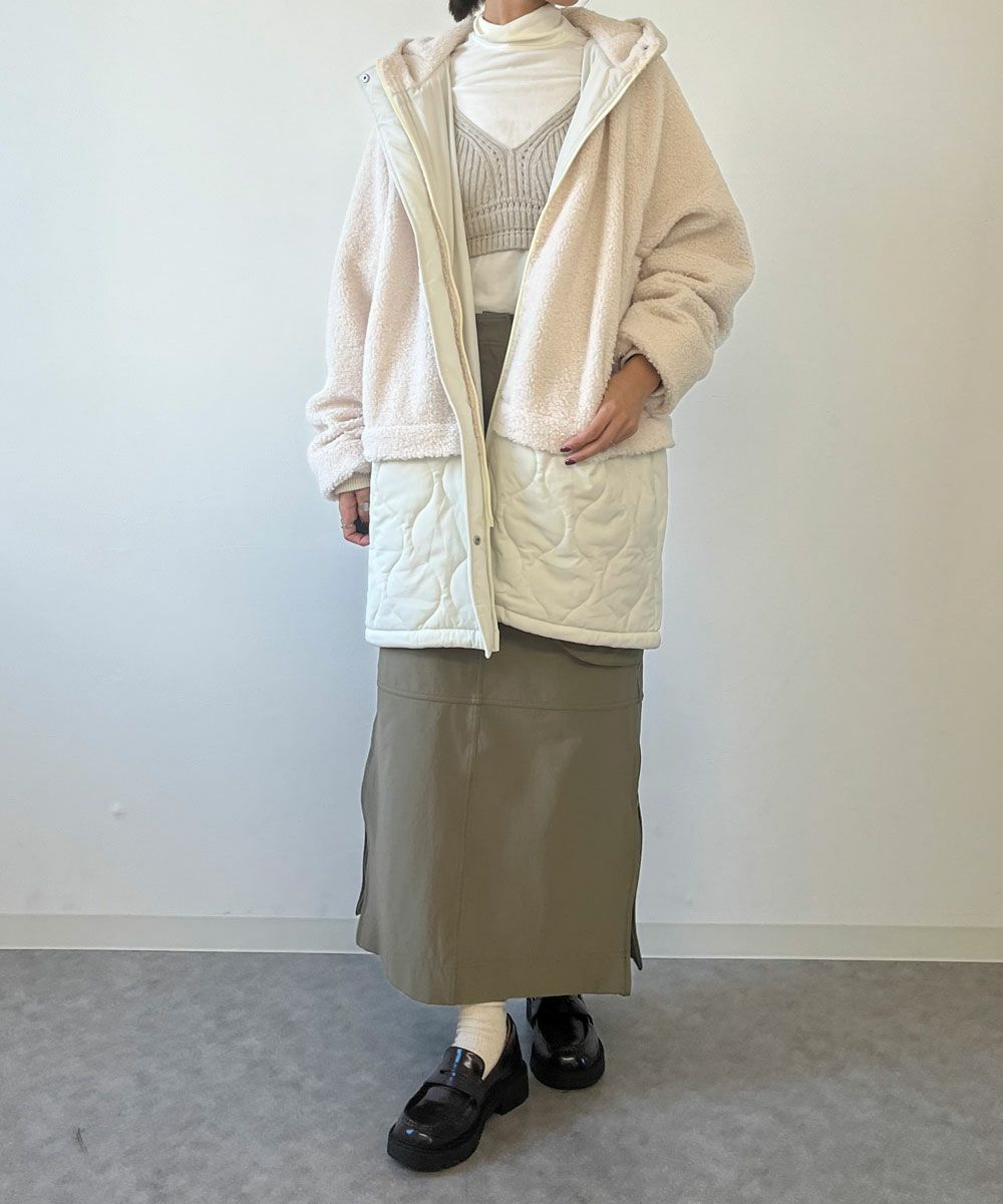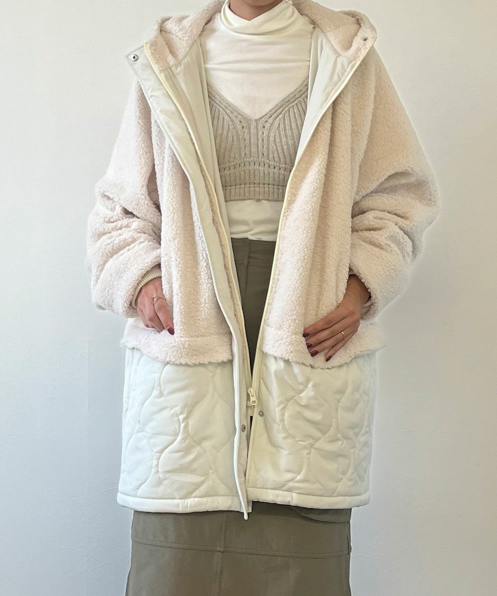 マットな品のある質感のキルティング素材と、ふわふわのボア素材を切り替えでスッキリ見せてくれる、ドッキングボアキルトコート!