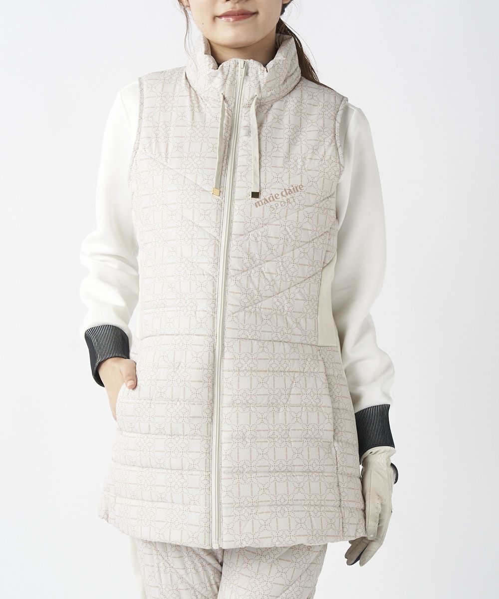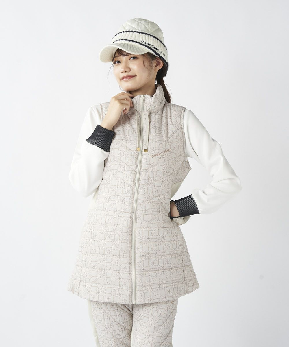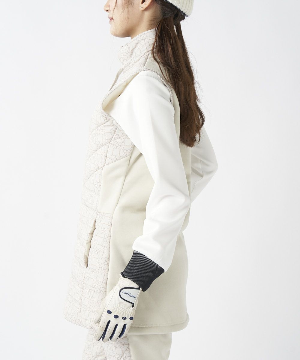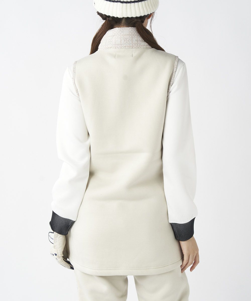 少し高めのウエスト切り替えで、脚長効果が期待できます!スウェットの裏起毛素材と中綿の組み合わ せなので、さっと羽織れて暖かく、動きやすいのでワンマイルにぴったり。お尻までしっかりカバーできる 使いやすいロング丈のベストです。