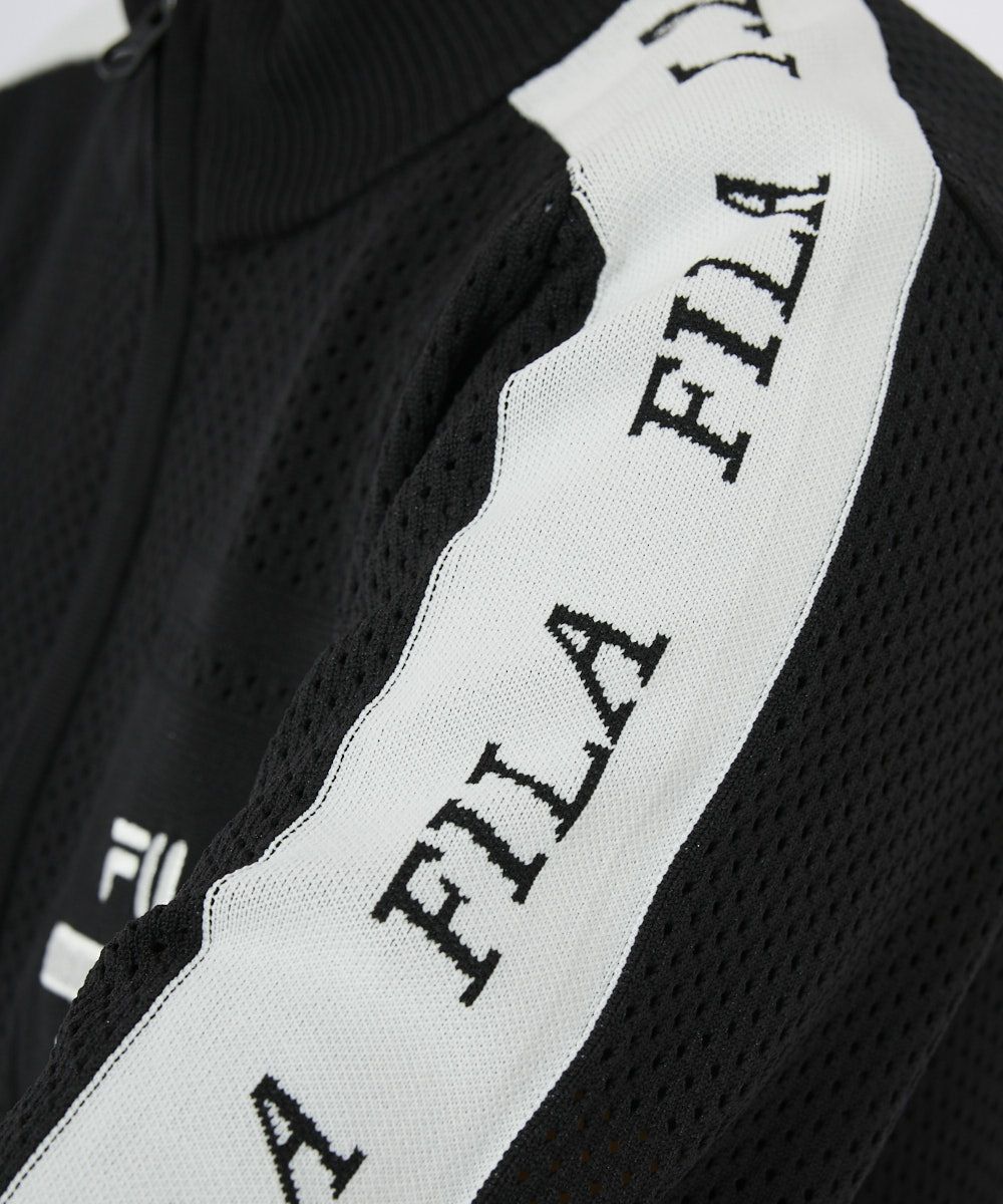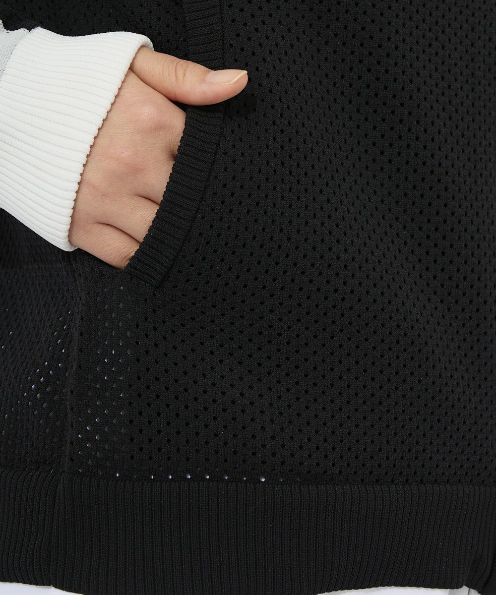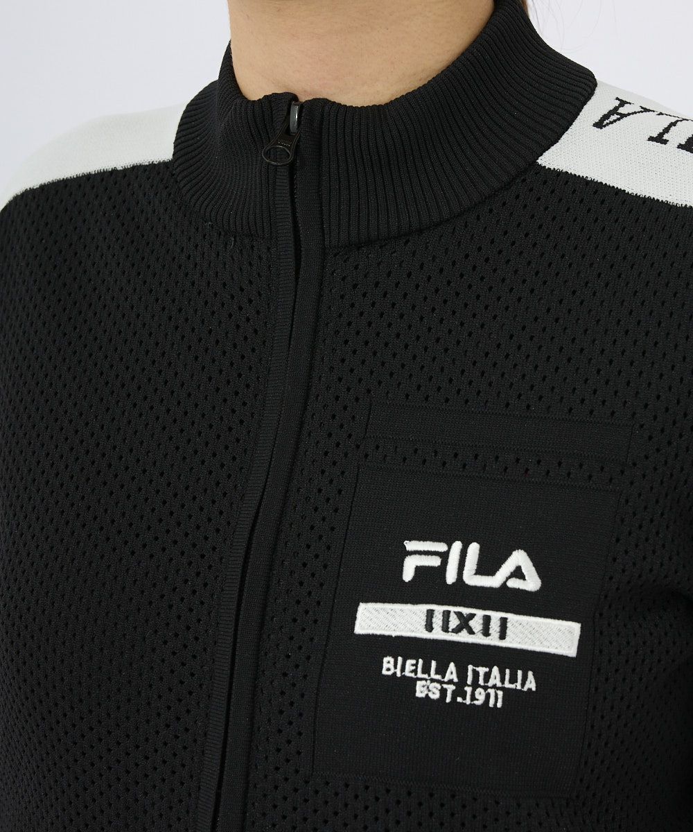 軽量のポリエステル糸を使用した、春先から活躍するニット素材のメッシュブルゾン袖山の配色ラインや、左袖 山にロゴジャガードを施したスポーティなデザイン。