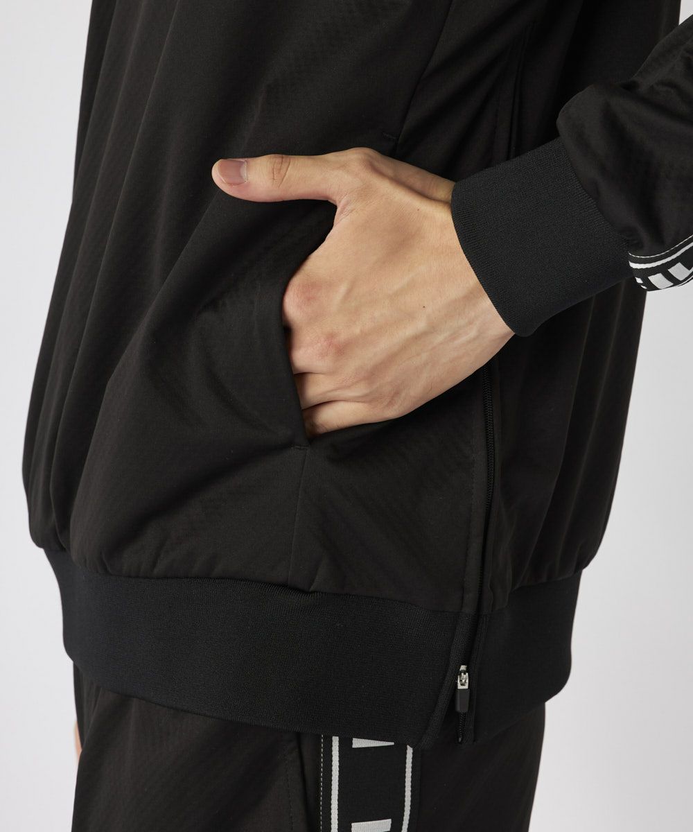 極薄素材に防風フィルムとメッシュをボンディングした**「ウインドガードライト」素材を使用。驚異の4WAYストレッチ機能で、ダイナミックなスイングもストレスなくサポートします。軽量性と確かな防風性**を兼ね備え、肌寒くなる季節のゴルフに最適な、軽やかに羽織れるアイテムです。