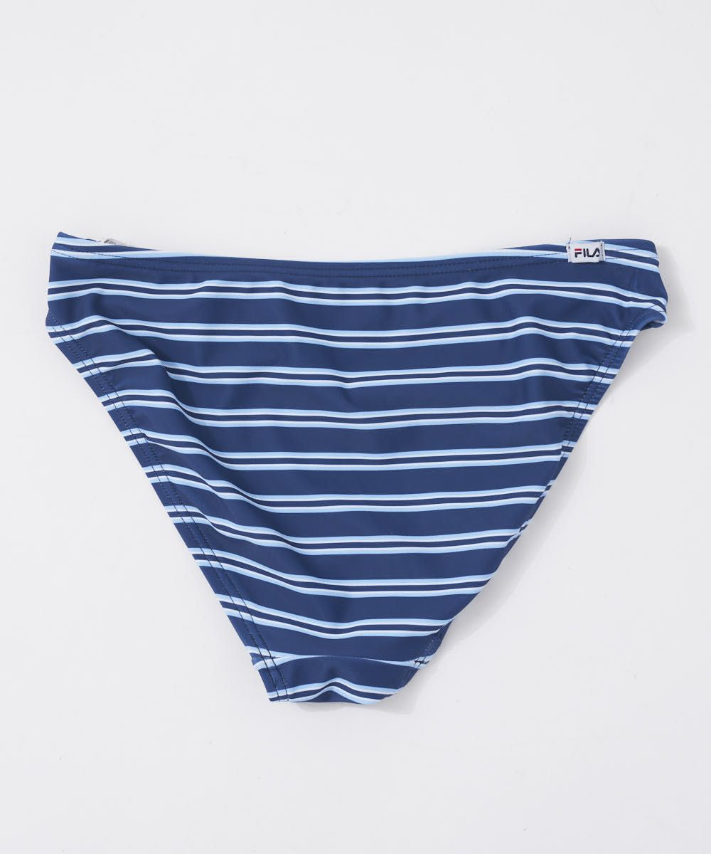 Tシャツ+タンキニ+ビキニパンツ+スウェット生地パンツの4点セット 胸元のFILAロゴがカラフルでイ ンパクトを与えています。ラグラン袖で色変えすることでスポーティーカジュアルに。タンキニ水着もボーダー なのでTシャツを脱いでもオシャレな感じです。海やプールでも使用できる便利なセット水着です。