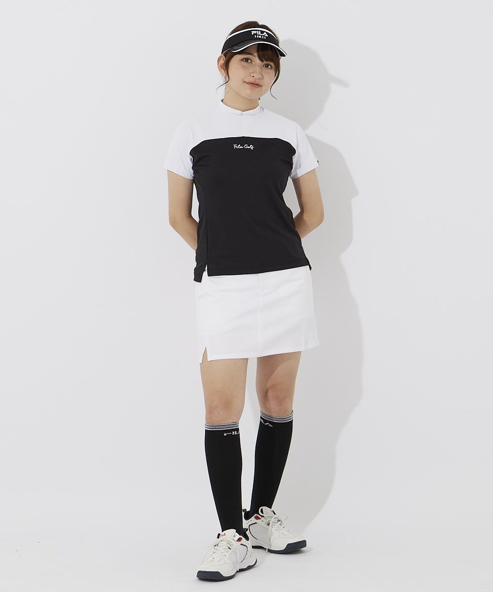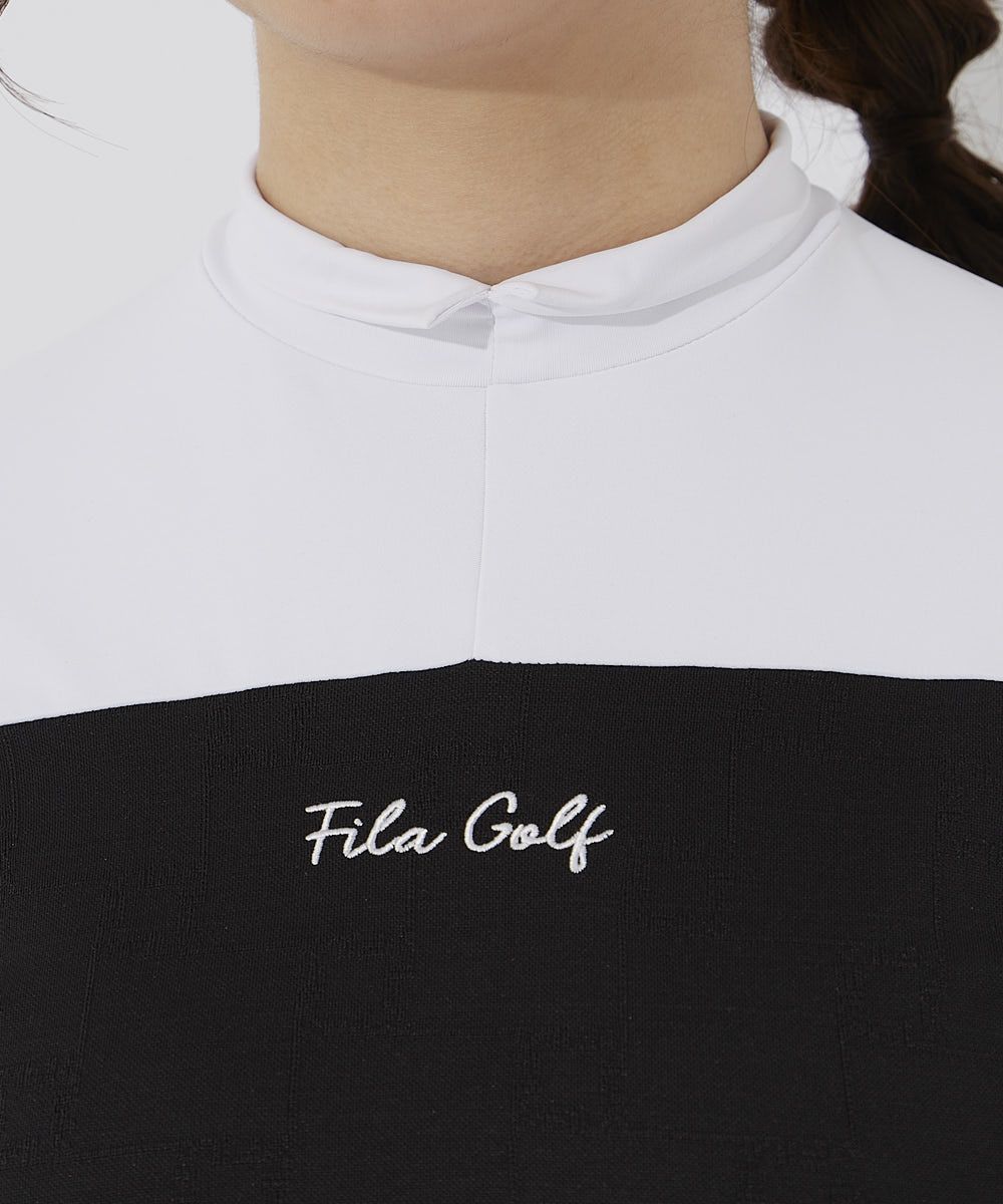 動きやすい変形ラグランスリーブシャツ。脇線を前側に寄せることで、細見せ効果を持たせました。FILAロゴをジャガードで表現したストレッチ性の良い素材を採用。