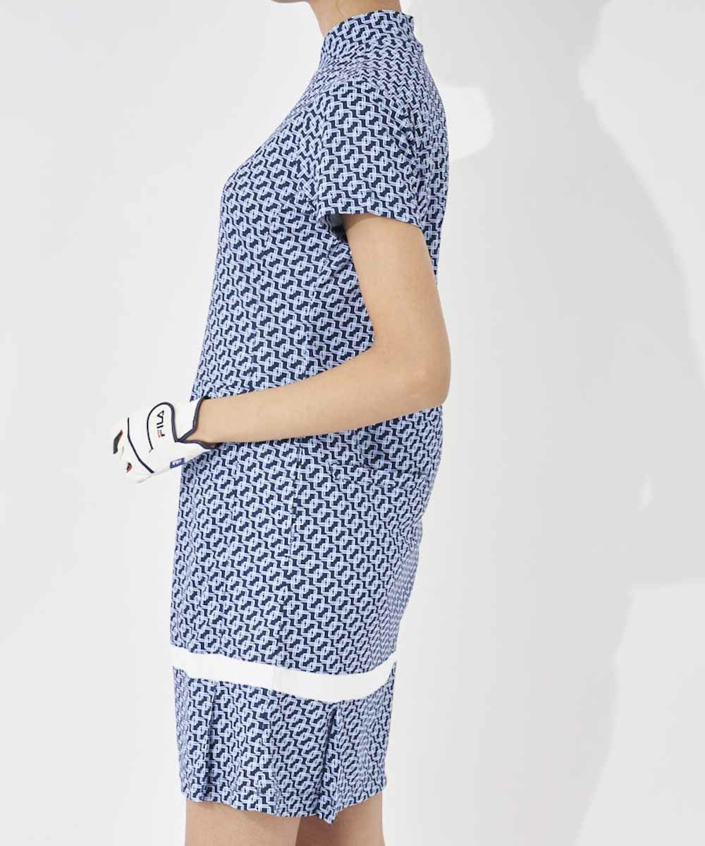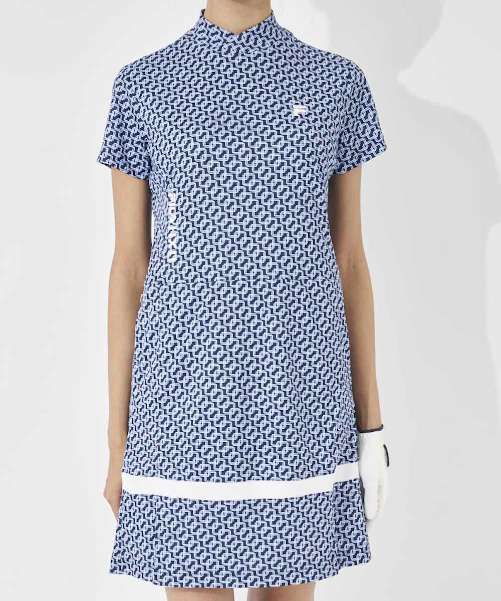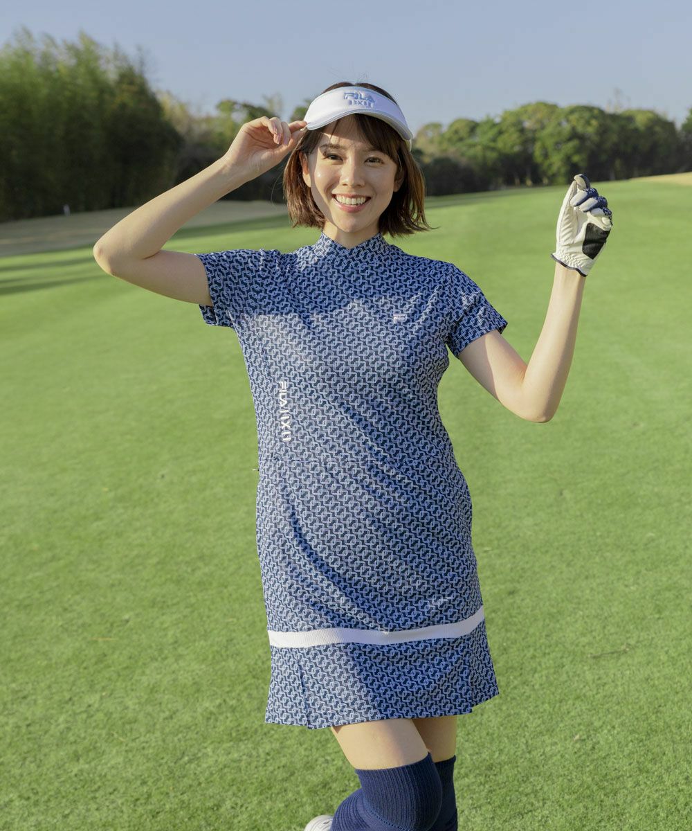 レトロな小つき柄をスポーティなデザインに落とし込んだ、変形モックネックのワンピース。スカート裾にプリーツを取り入れ、かわいらしいイメージをプラスしました。接触冷感、吸汗速乾でいつでもサラッとした着心地、さらにUVカットも備えた機能性素材なので、夏のゴルフも快適にプレーしていただけます。