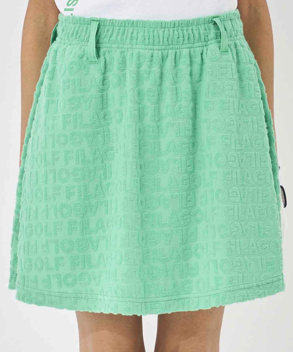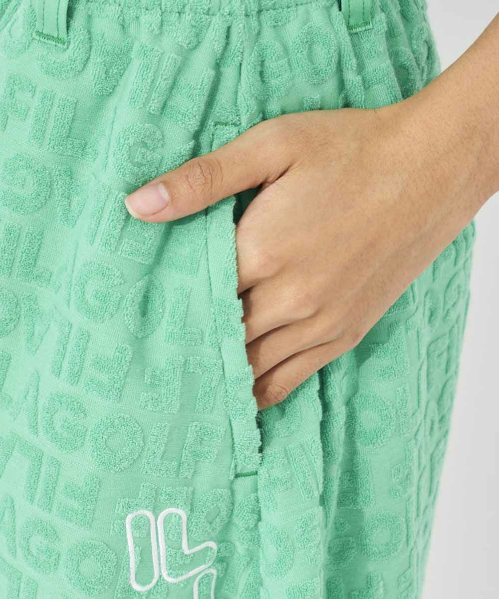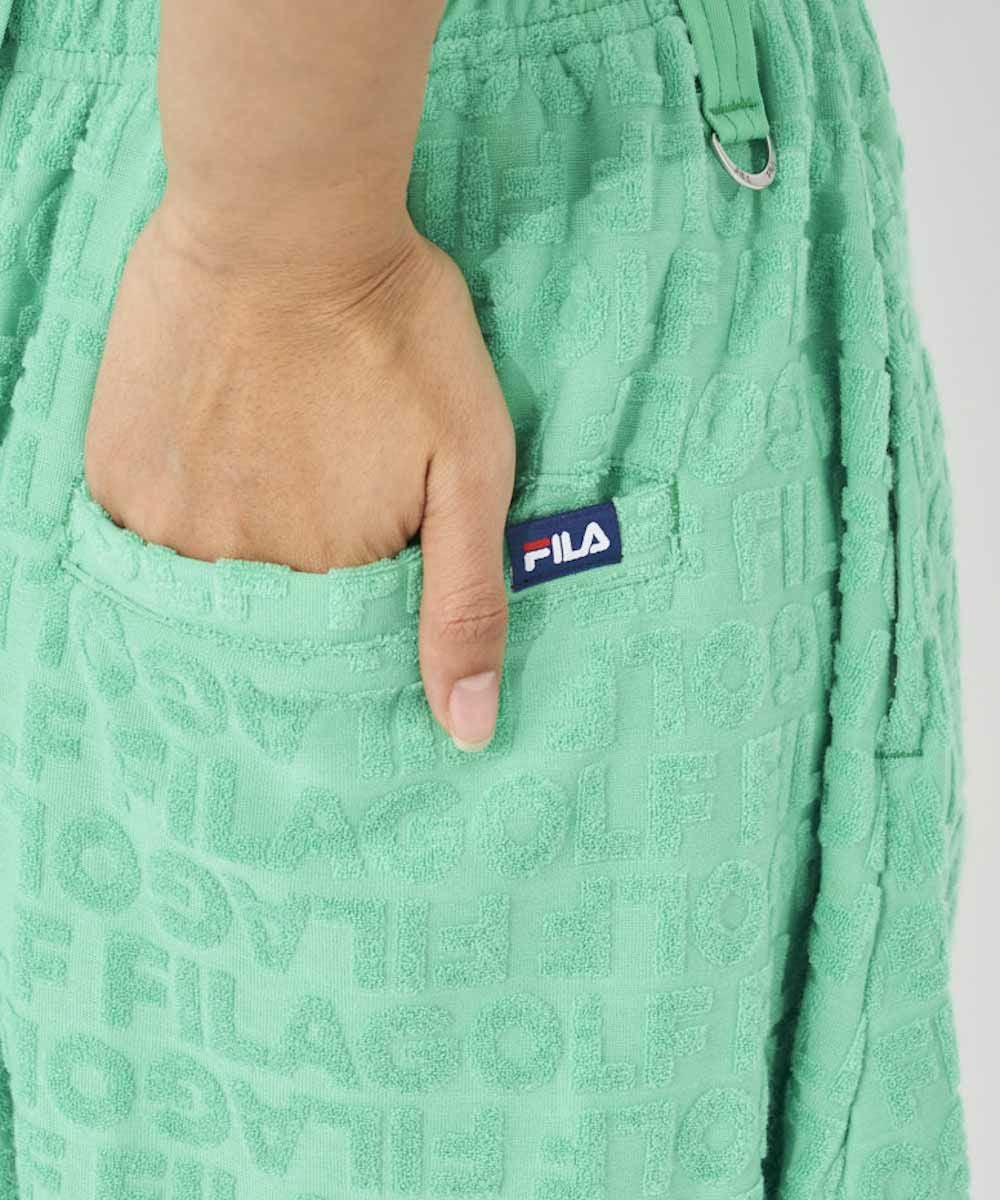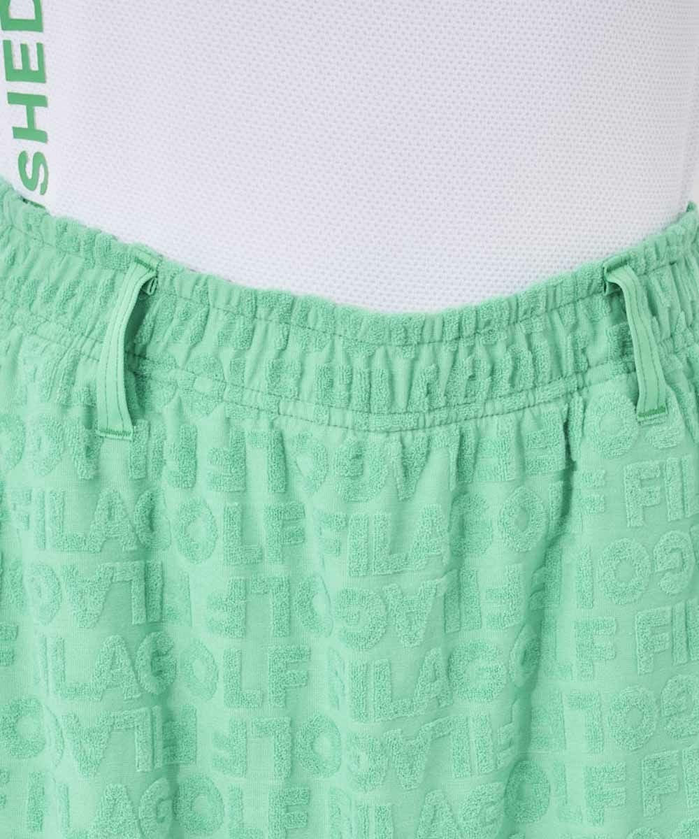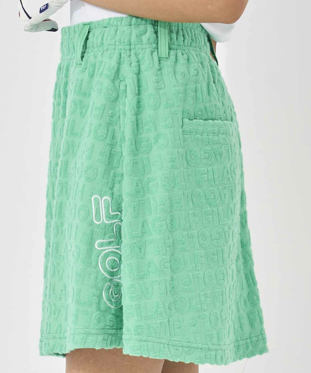 「FILA GOLF」をアレンジしたタイポグラフィ柄のジャガードパイル素材を使用。スイング時に中が見 えないか心配な方にも安心な見せパン仕様です。