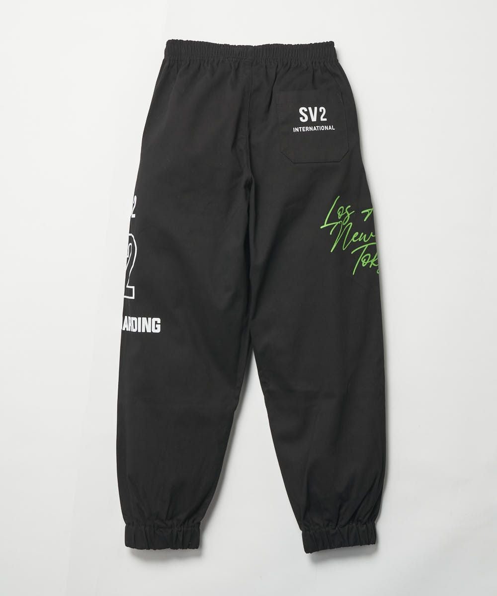 プリントが散りばめられているデザイン性のあるロングパンツ。裾が絞られているので多少大きくても履きこな しやすい仕様になっています。