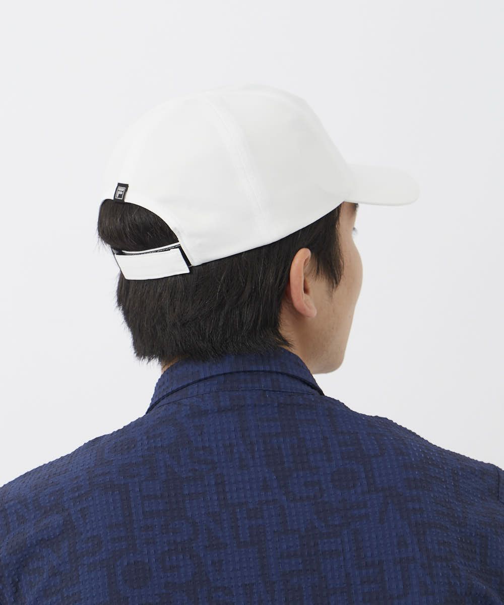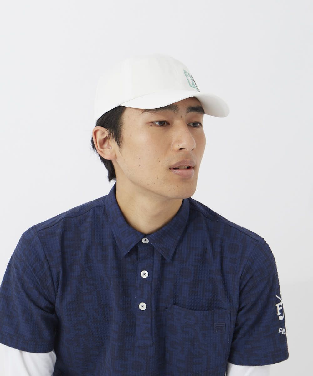 撥水加工のタフタ素材のシームレスキャップ。撥水加工+裏シームテープ使用で雨の日でも快適にプレーできます。立体感のあるFILAGOLFシリコンプリントが入ります。