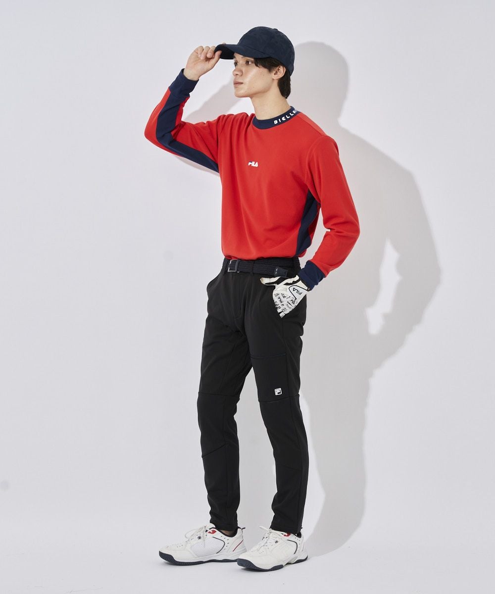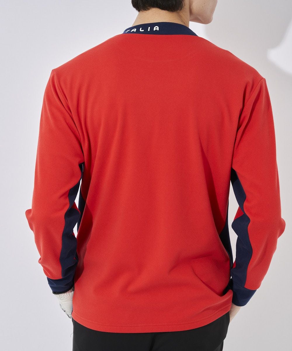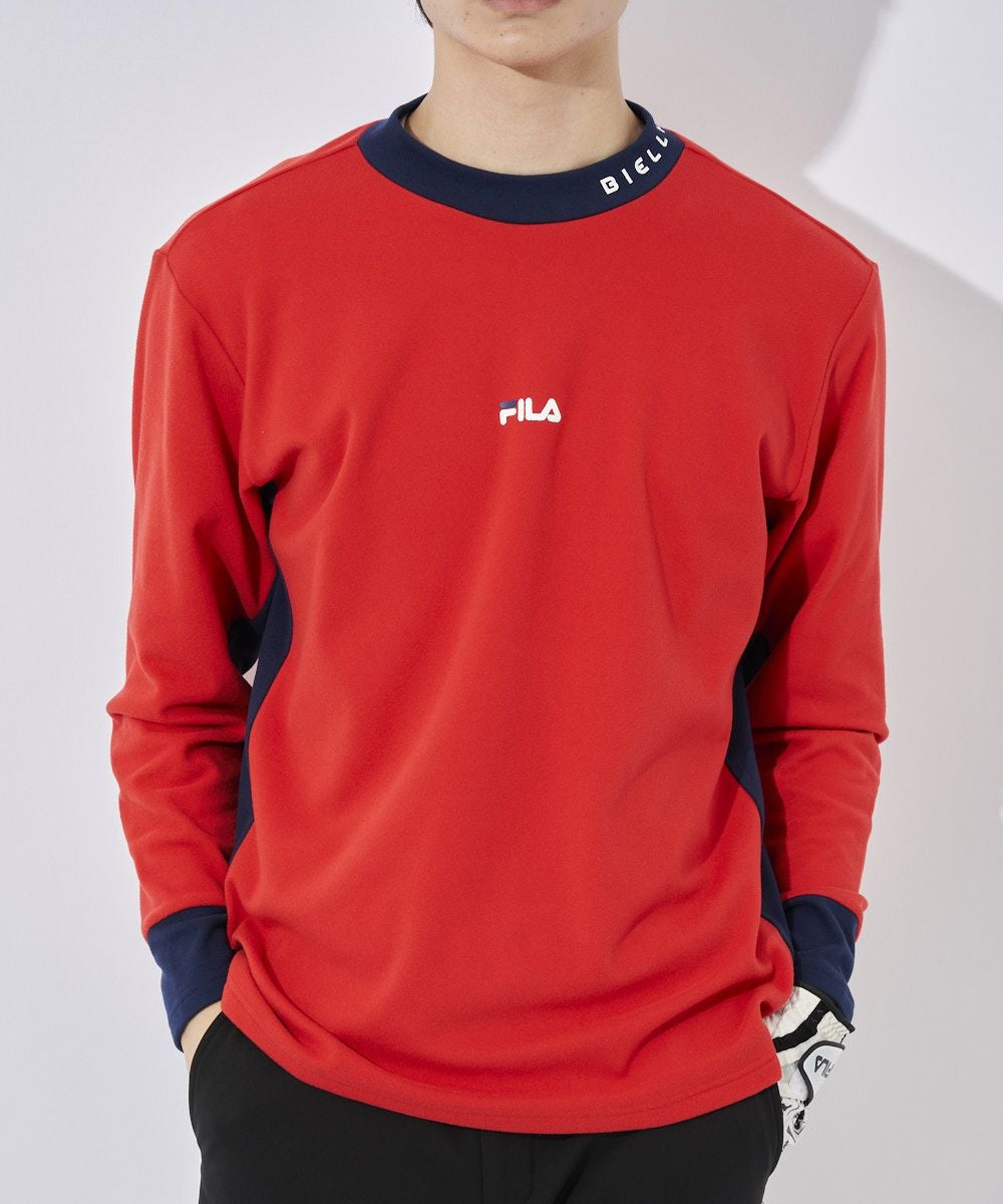 温かみのある両面起毛した素材のモックネックシャツ。 大胆なトリコロール配色が着こなしのアクセントにも なるアイテムです。襟元と胸にロゴが入ります。