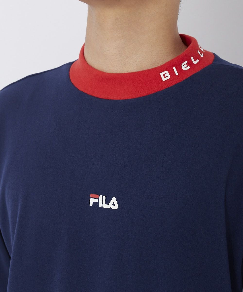 温かみのある両面起毛した素材のモックネックシャツ。 大胆なトリコロール配色が着こなしのアクセントにも なるアイテムです。襟元と胸にロゴが入ります。