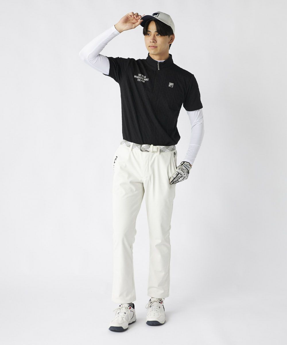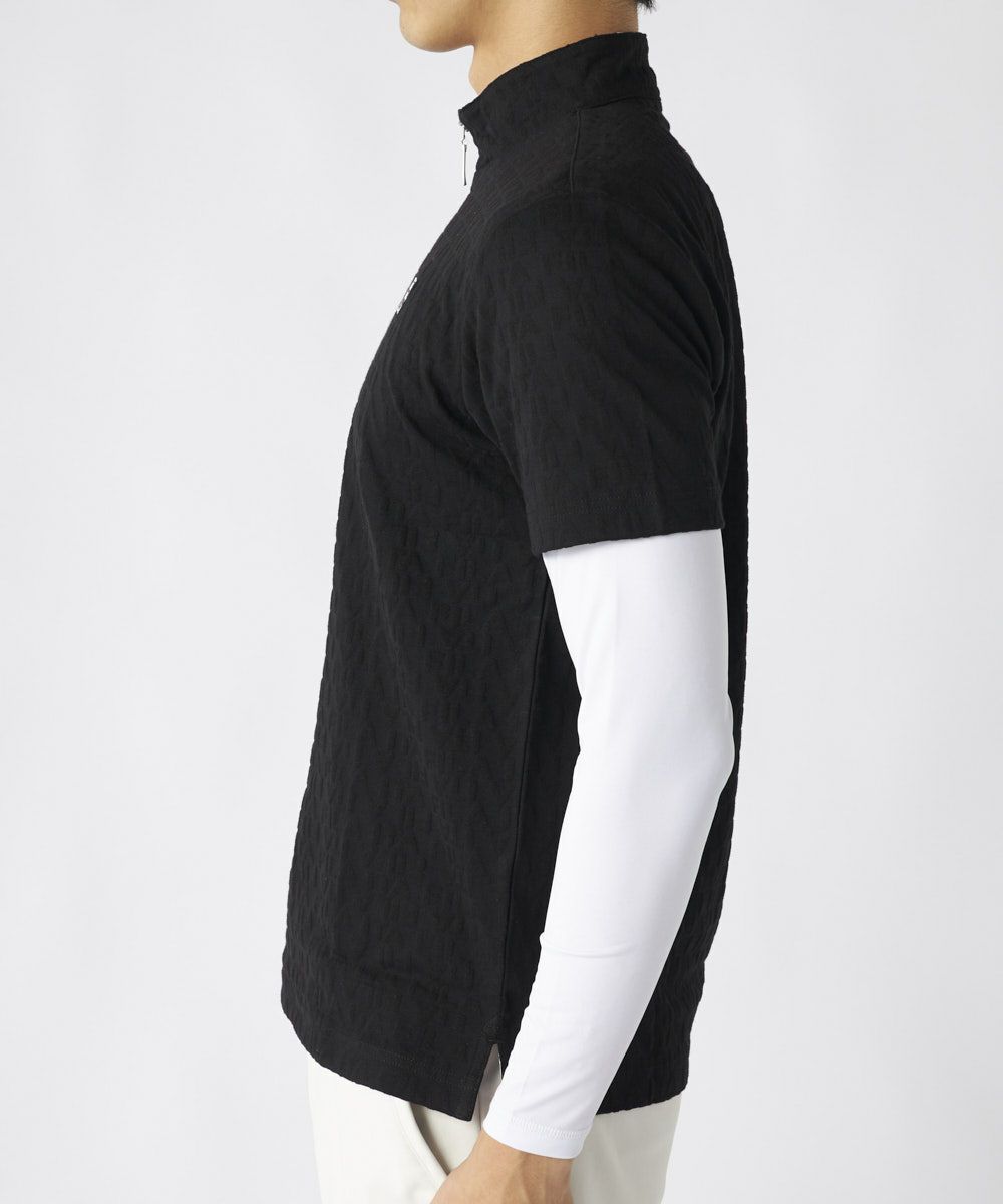 表情豊かな3Dジャガード素材を採用した半袖シャツと、ハイネックインナーのツインセットです。インナーは薄手ながら暖かさを保ち、肌寒い季節も快適なプレーをサポートします。アウター・インナーともにUVカット機能を備え、季節の変わり目や日差しが強い日でも安心してアクティブに動けます。