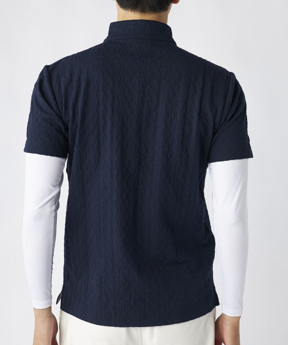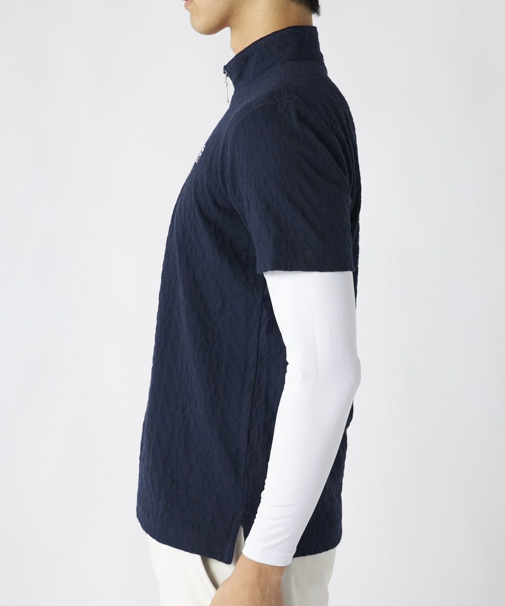 表情豊かな3Dジャガード素材を採用した半袖シャツと、ハイネックインナーのツインセットです。インナーは薄手ながら暖かさを保ち、肌寒い季節も快適なプレーをサポートします。アウター・インナーともにUVカット機能を備え、季節の変わり目や日差しが強い日でも安心してアクティブに動けます。