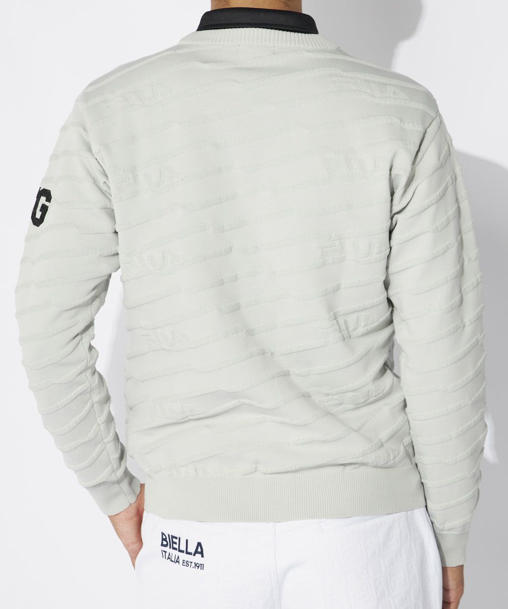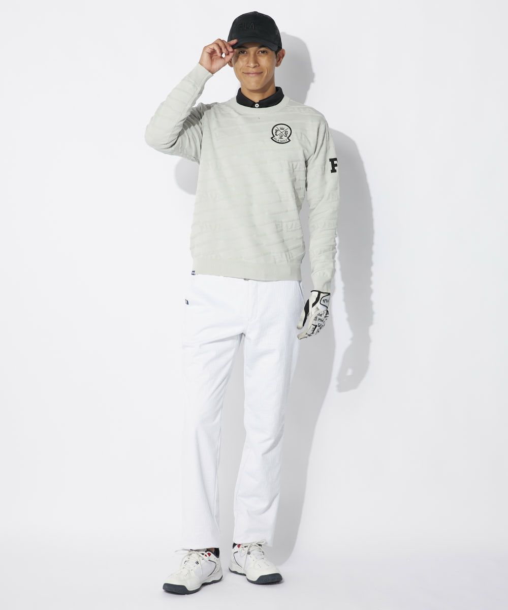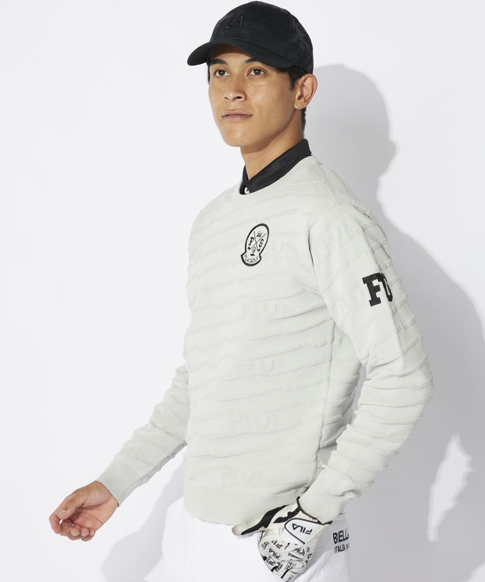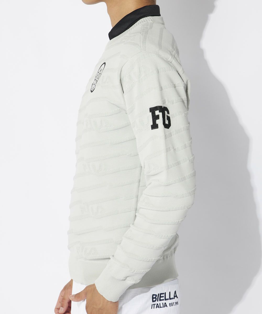 エコに配慮したリサイクル糸を使用。軽くて動きやすいポリエステルニット素材の丸首セーター。天竺と鹿の子で編み立 てた1トーンのシンプルで着やすいアイテムです。エンブレム刺繍とFGモチーフが入ります。