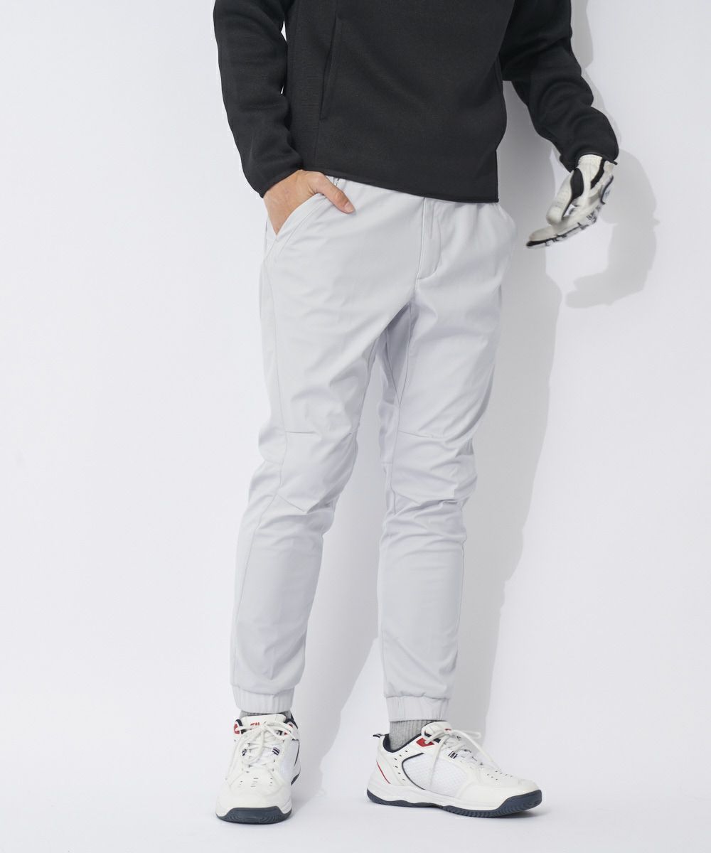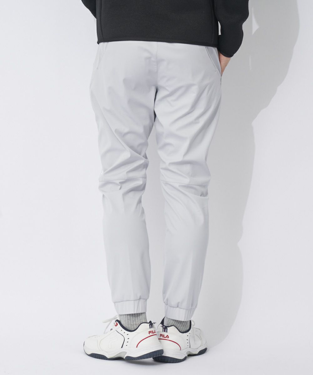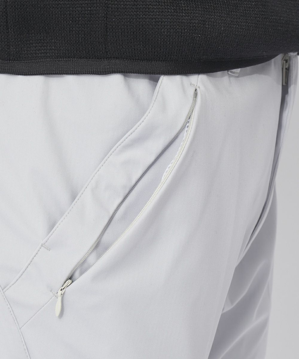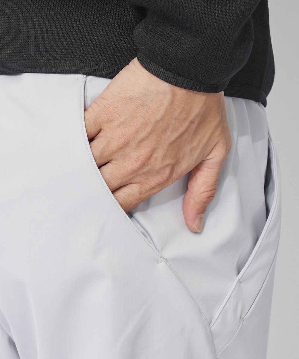 縦横伸びる3層のボンディング素材を使用したパンツ。右ポケットはマスクや小物を収納できるダブルポケット 仕様。 F-BOX刺繍が入っておりゆったりと履けるウエストシャーリング仕様。