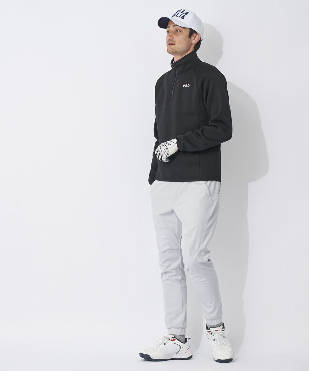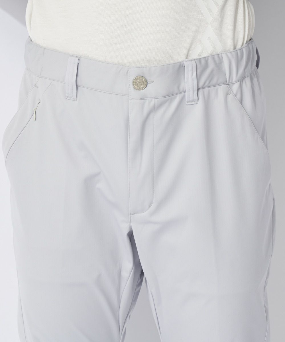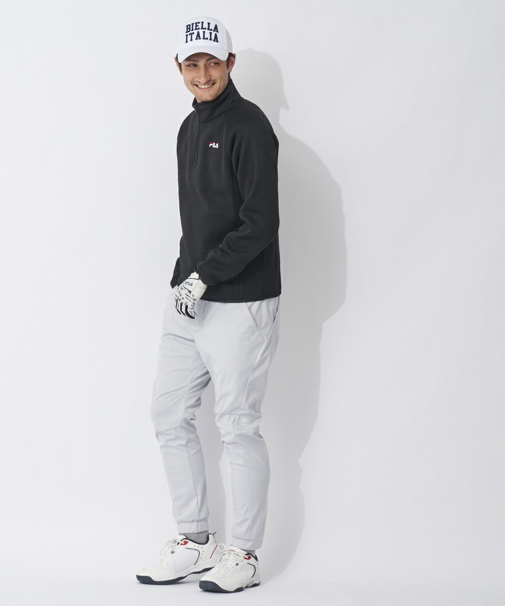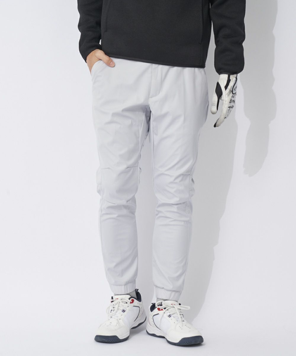 縦横伸びる3層のボンディング素材を使用したパンツ。右ポケットはマスクや小物を収納できるダブルポケット 仕様。 F-BOX刺繍が入っておりゆったりと履けるウエストシャーリング仕様。
