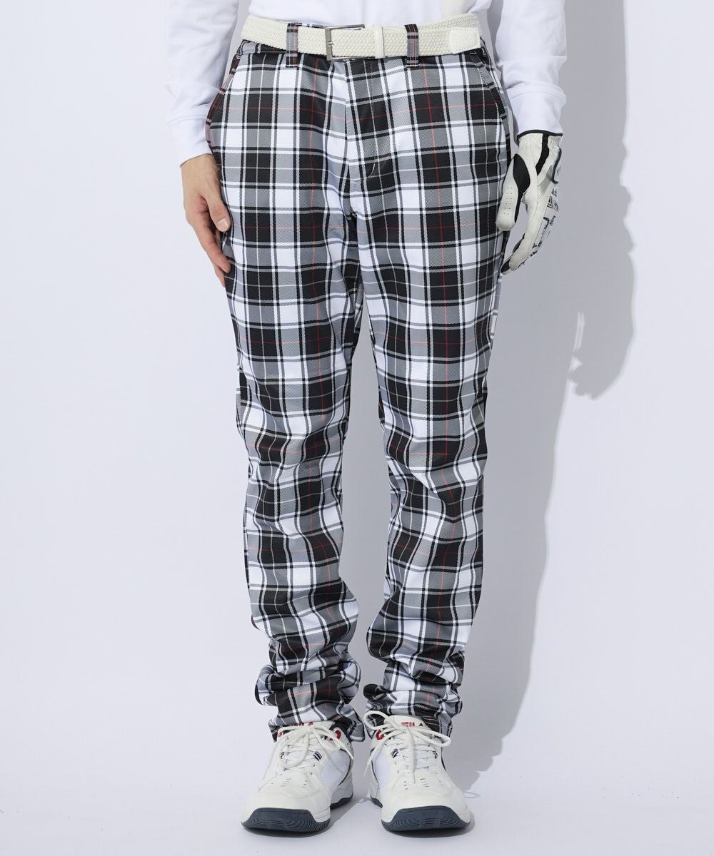 ストレッチ性があり裏フリース素材とフィルム加工の3層ボンディングを使用したあったか細身のテーパードシ ルエットパンツ。 トラッドテイストのタータンチェックプリントデザインで着用しやすいウエストゴム仕様。