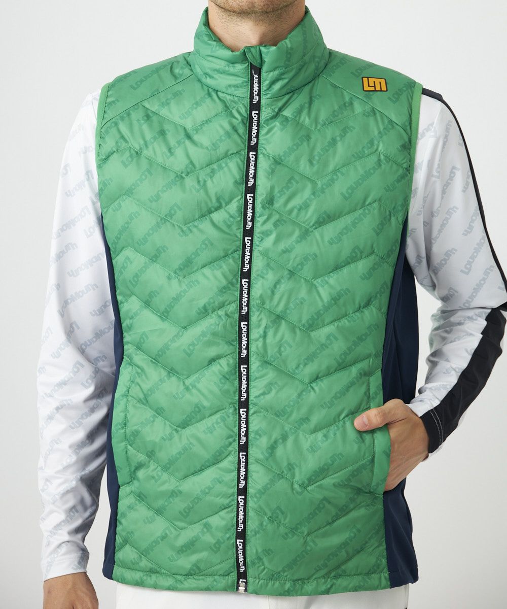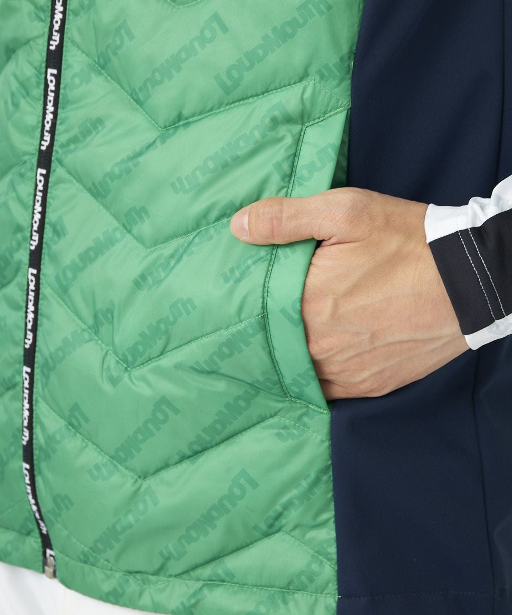 オリジナルのLOUDMOUTHロゴ柄のハイブリットダウンベスト。 無地ライクで豊富なカラーバリエーション展開でコーディネートしやすいアイテム。 フロントロゴプリントファスナーがデザインアクセント。