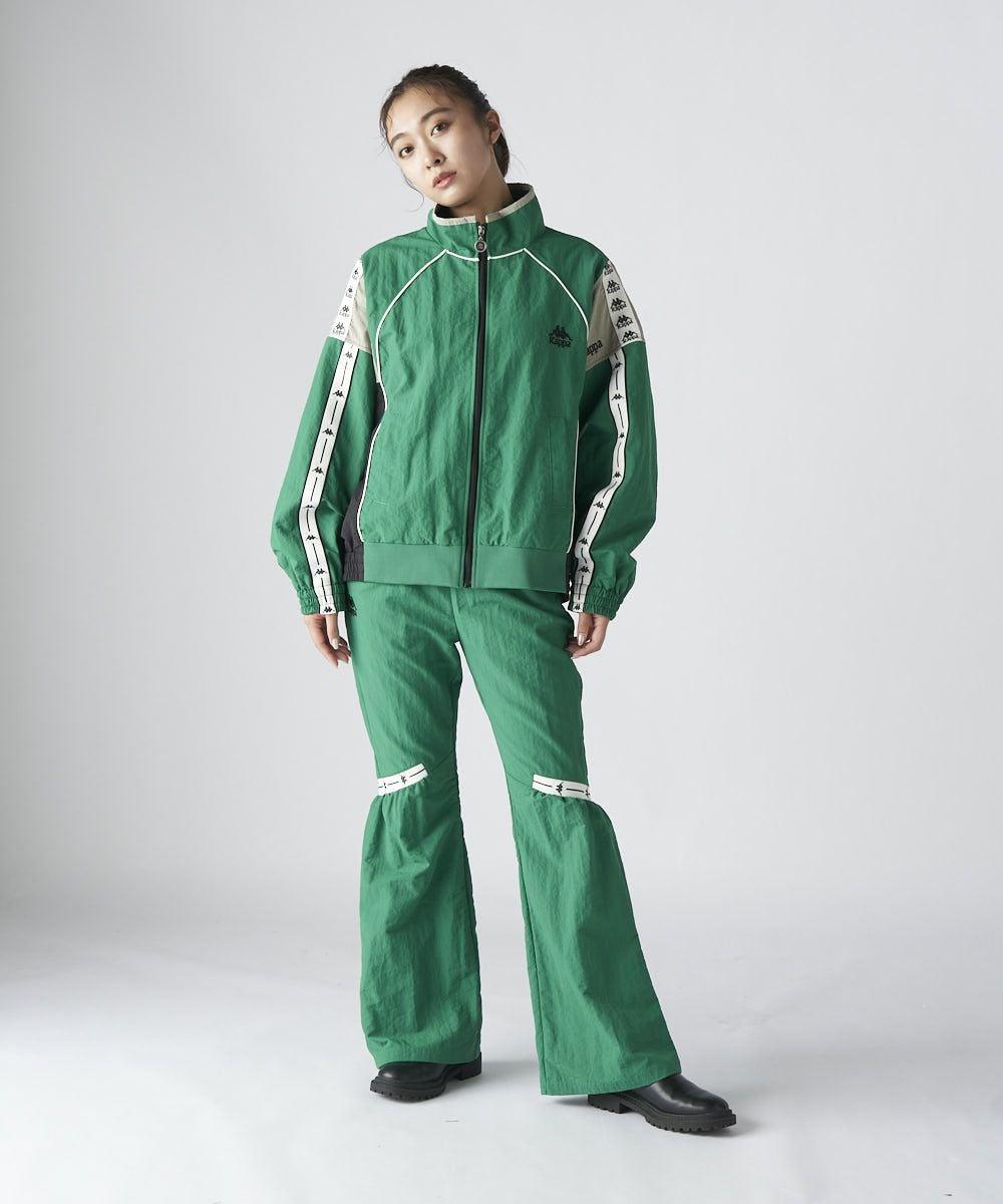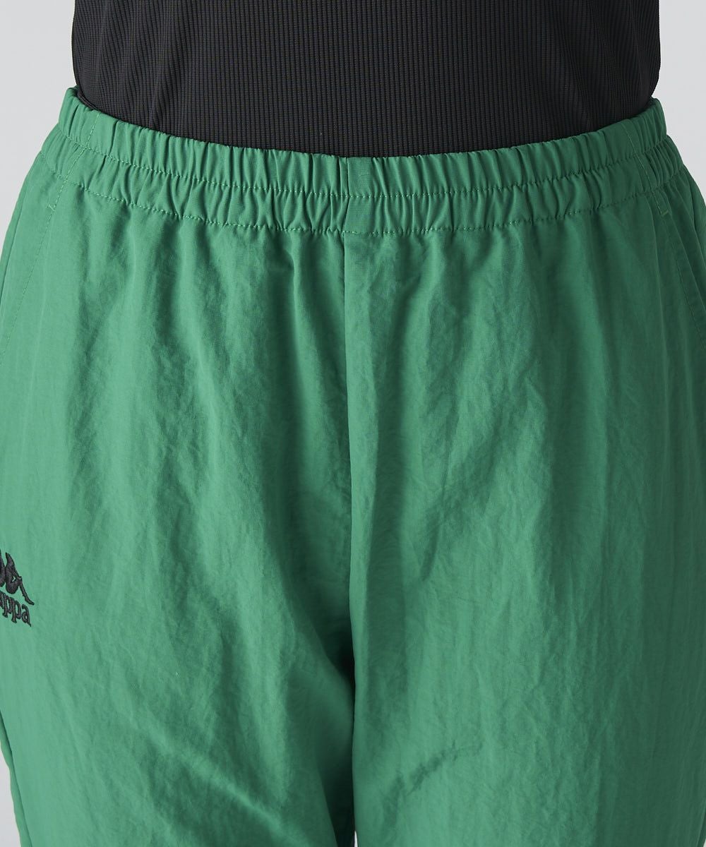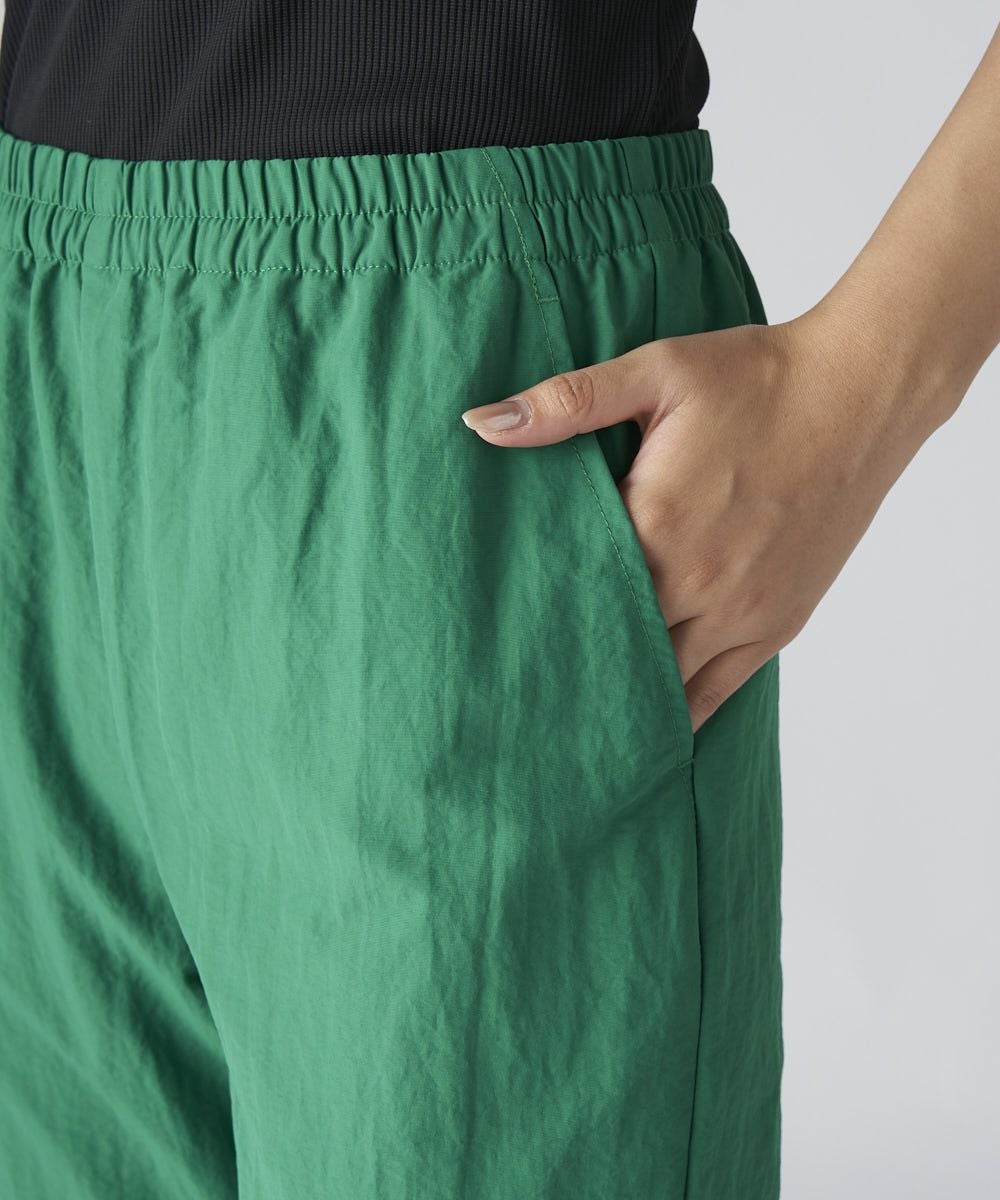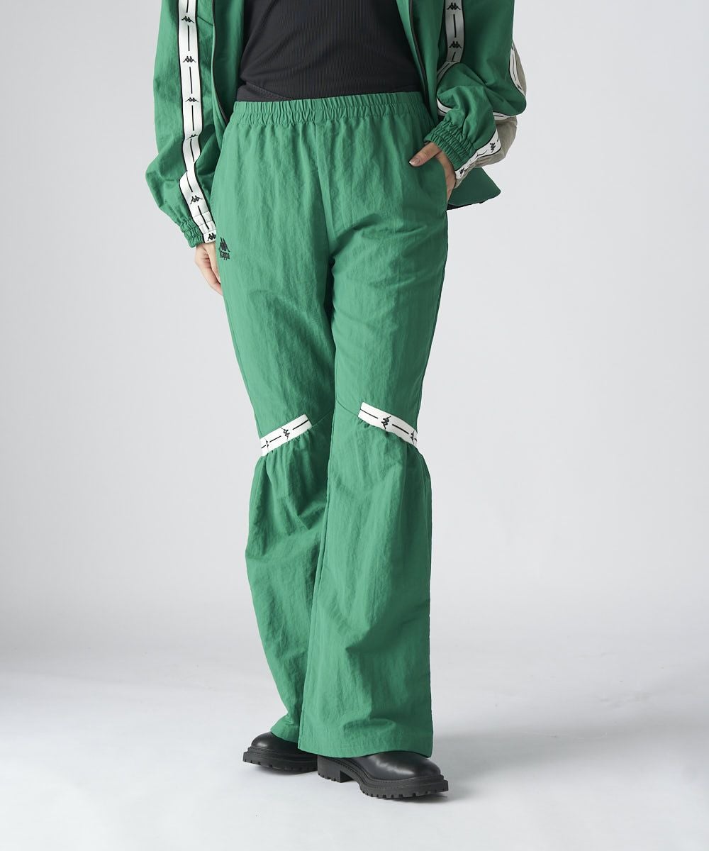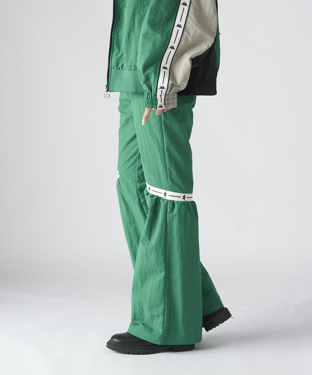 テープラインが特徴のナイロン素材のロングパンツです。膝上にテープラインを入れ、膝部分のパタ ーンを絞ることでスタイリッシュながら裾にかけてモード感を出しています。