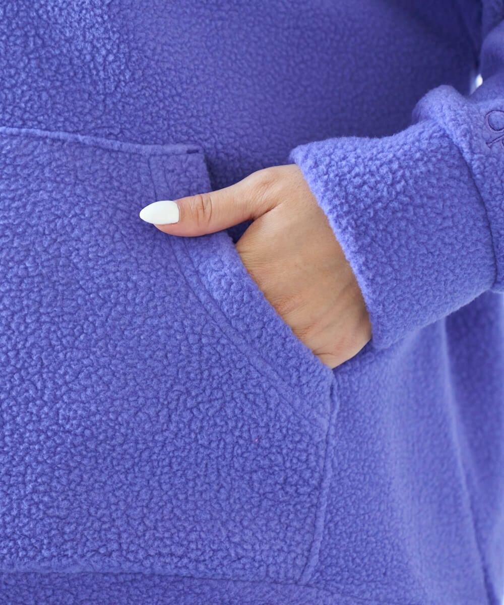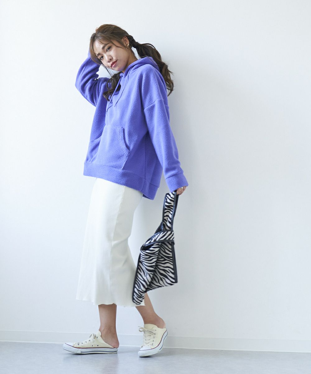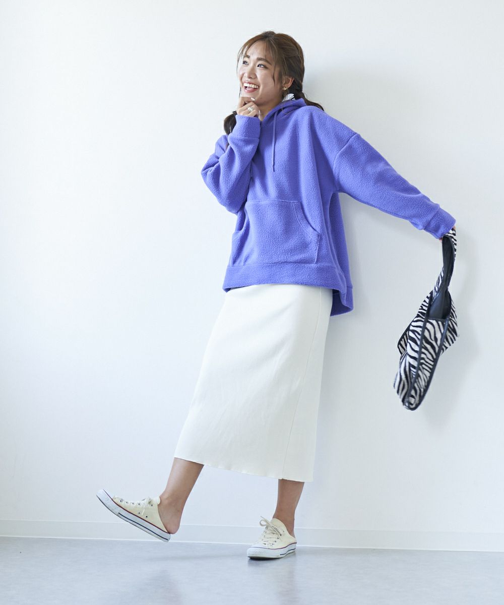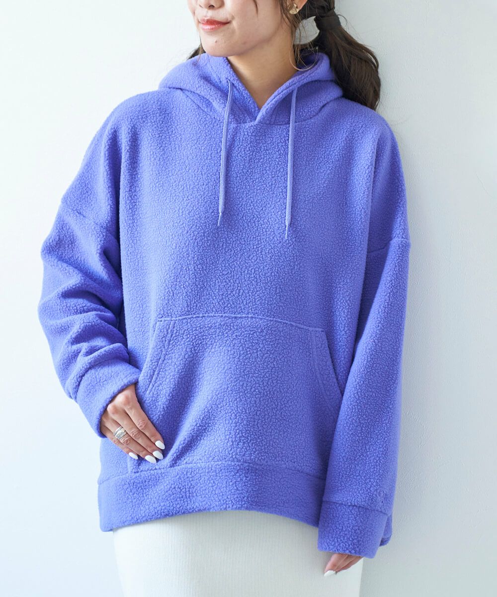 あったかライトボアフリース素材のカンガルーポケット付きフードプルパーカー。 ビビッドなカラーで秋冬のコーデをぱっと明るくします。