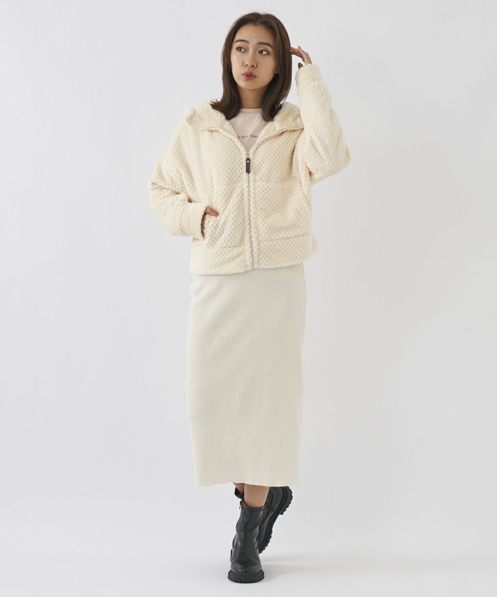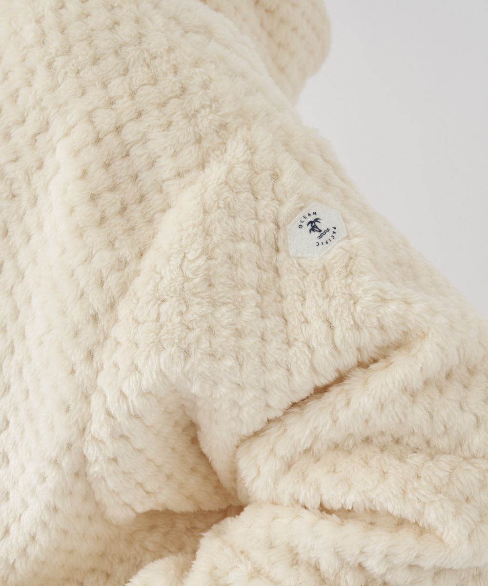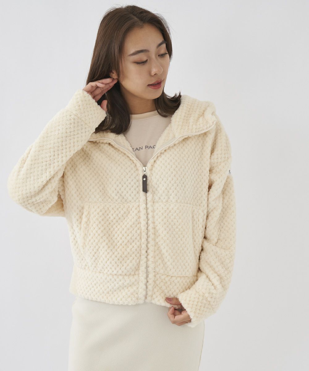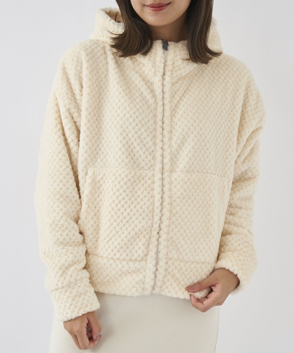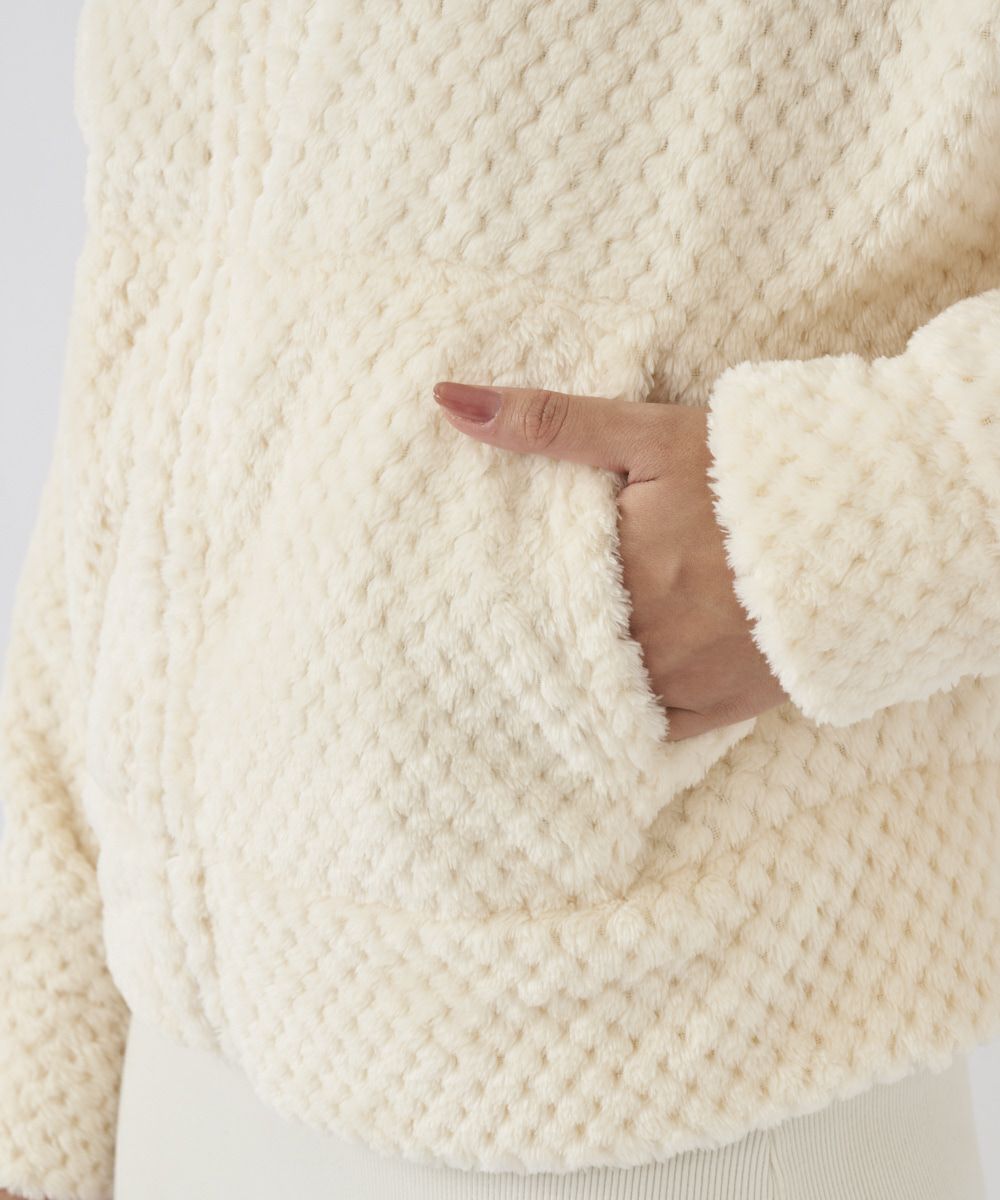 表面がぽこぽことしたボアでとっても軽くてとってもあたたかい!ジップで着脱しやすく、タウンユースにはもちろんルームウェアとしてもおすすめ。