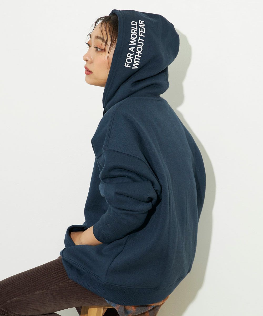 MサイズとLサイズとXLサイズの3サイズ展開で、レディースメンズ共に幅広く着用していただけます。フード部分にさりげなく入ったロゴプリントがポイント!