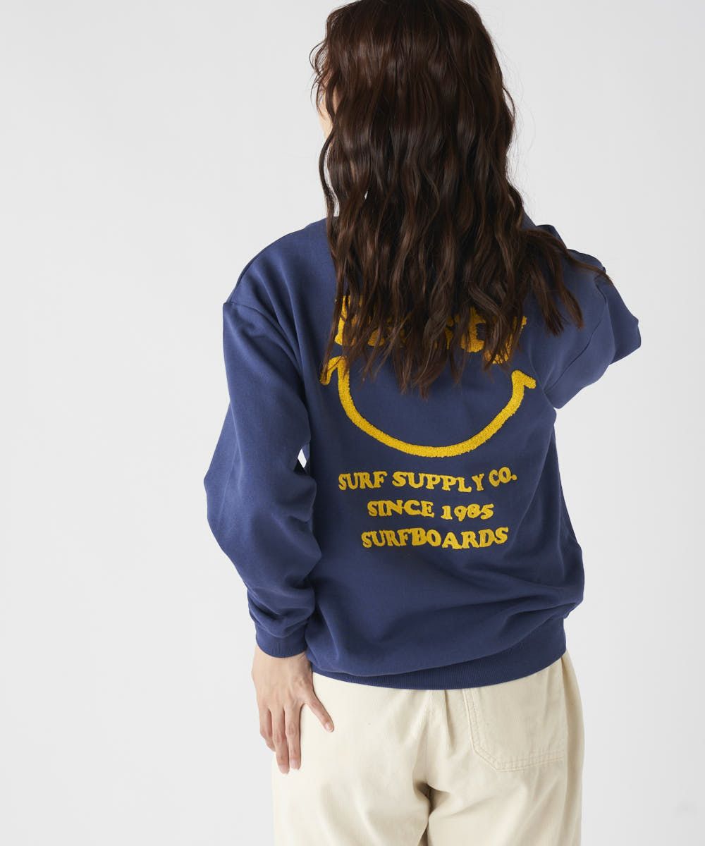 大人気ニコちゃんシリーズよりバッグ相良刺繍にフロントのネックにはチェーン刺繍が施されとっても可愛いクルースウェットです。