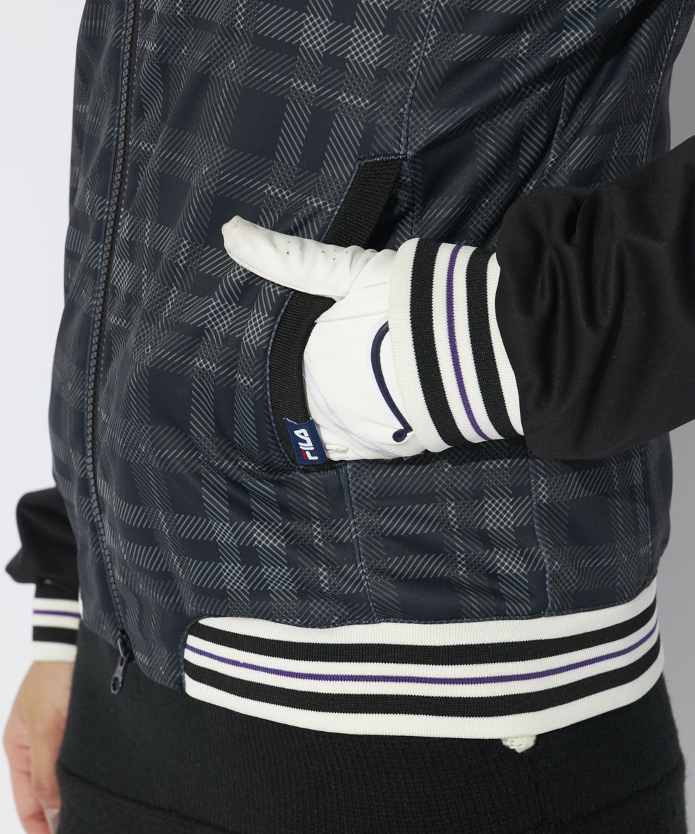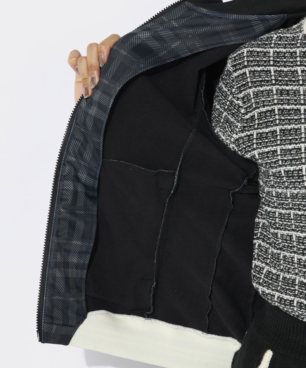袖は無地、身頃にはチェック柄をいれたボンディング素材のジャケット。極薄ニット素材とフリースの間に防風フィルムを挟んだ機能性の高いボンディング素材を使用。