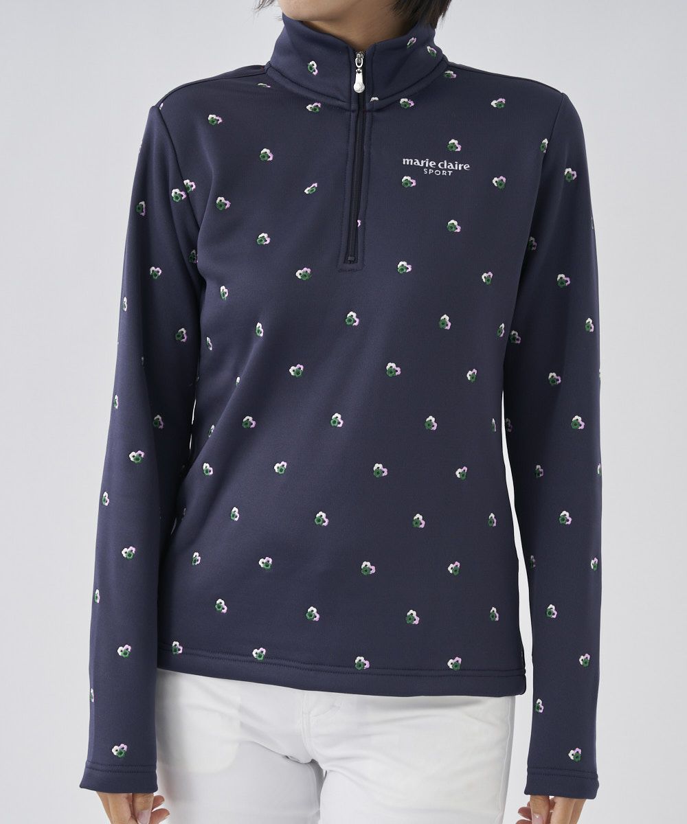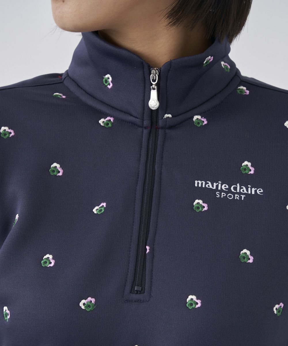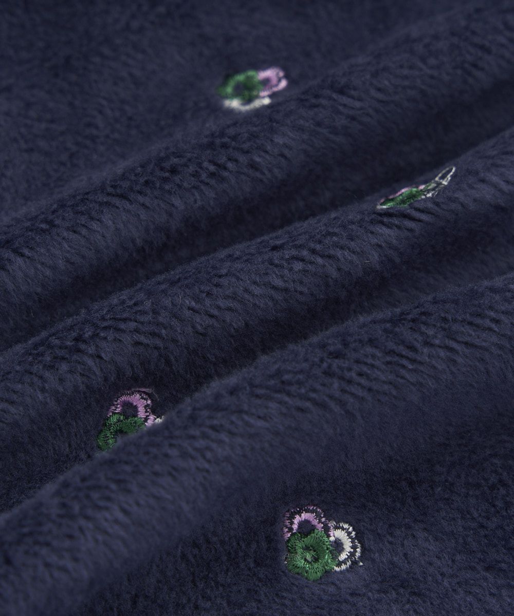 柔らかな肌触りの裏シャギーハイネックシャツです。お花の飛び柄刺繍が可愛い一枚です。