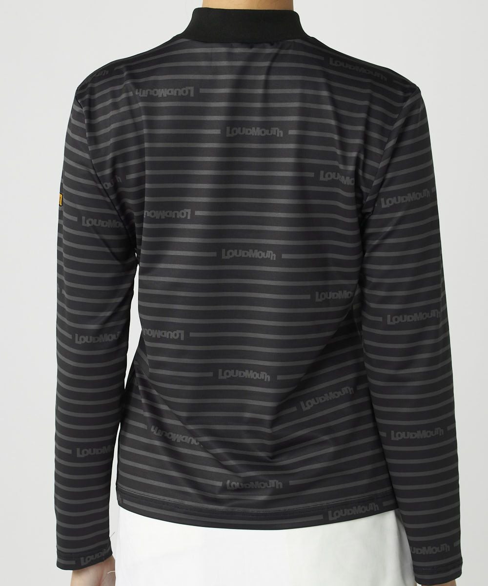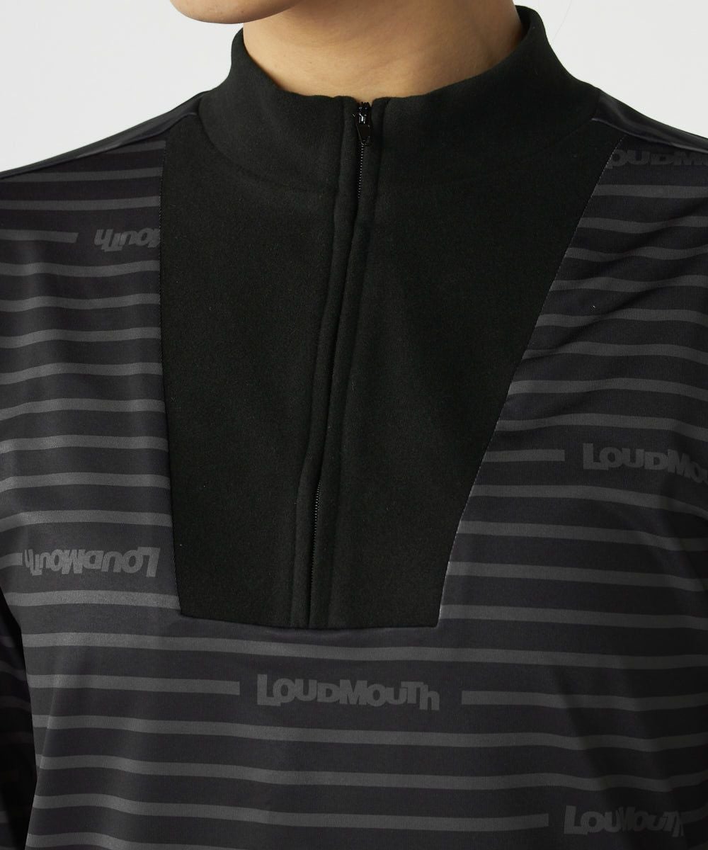 ECO裏起毛ベア天竺素材のボーダーとロゴプリントデザインのモックネックハーフジップシャツ。