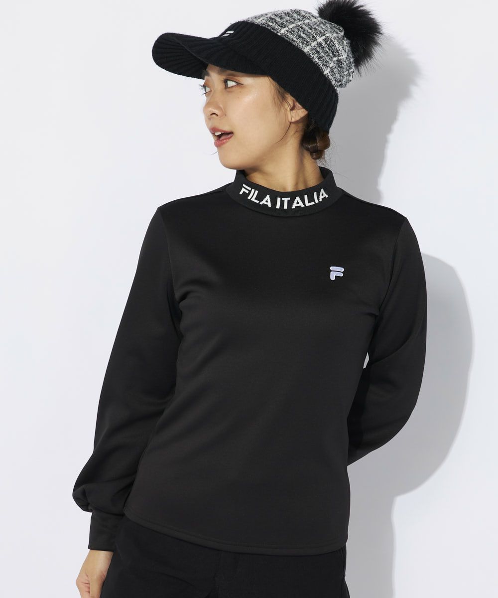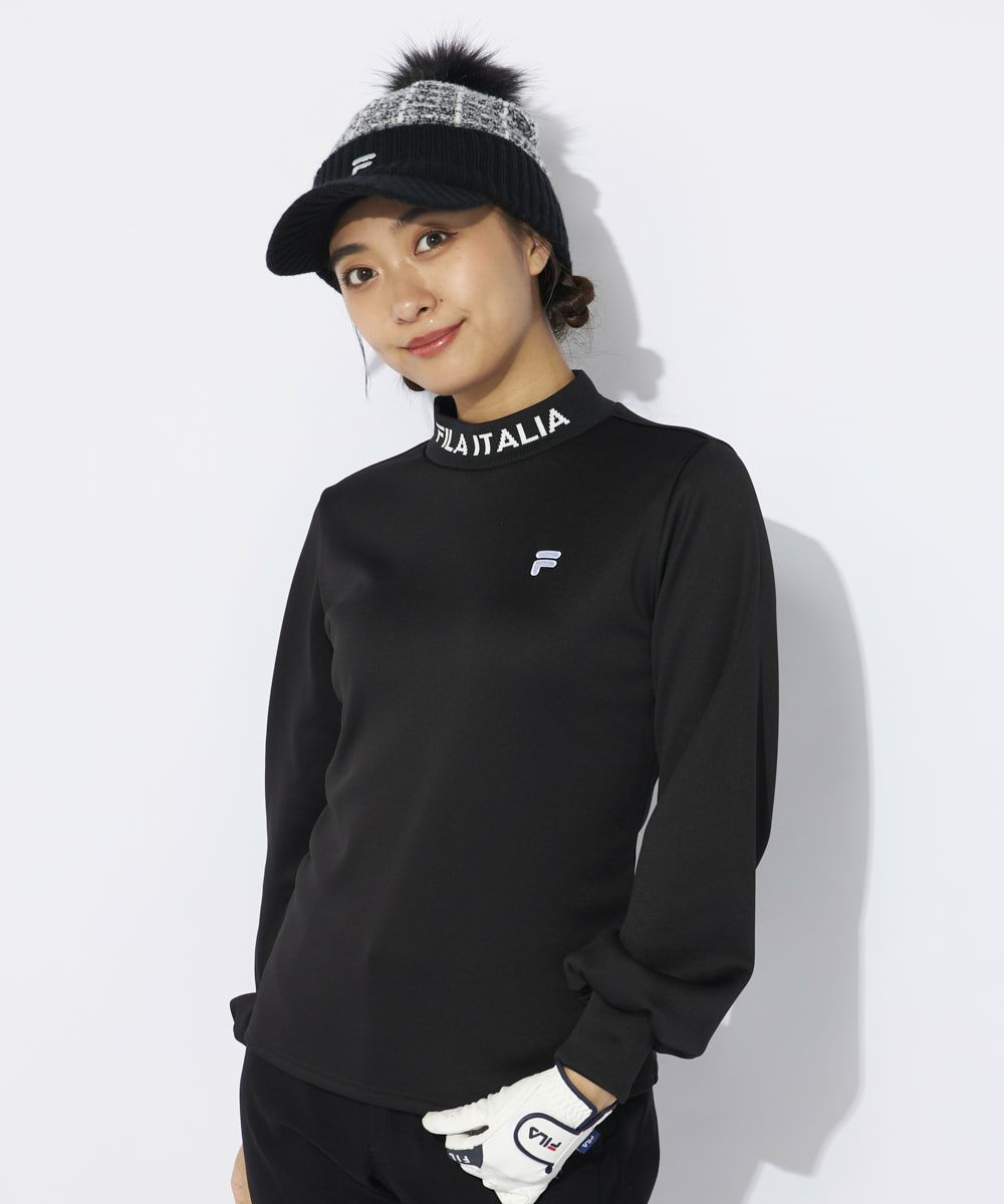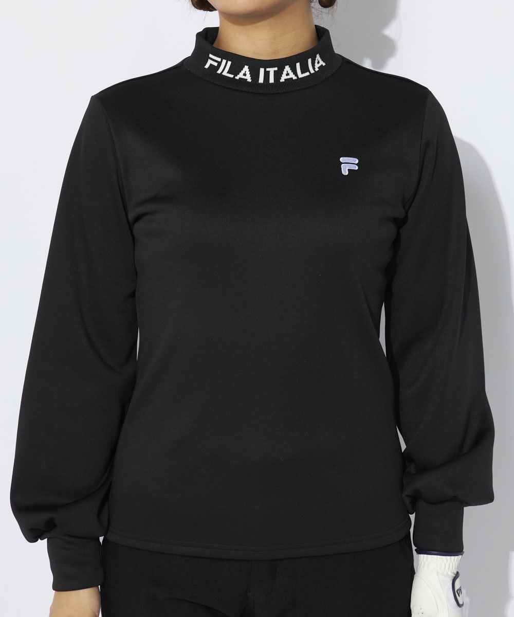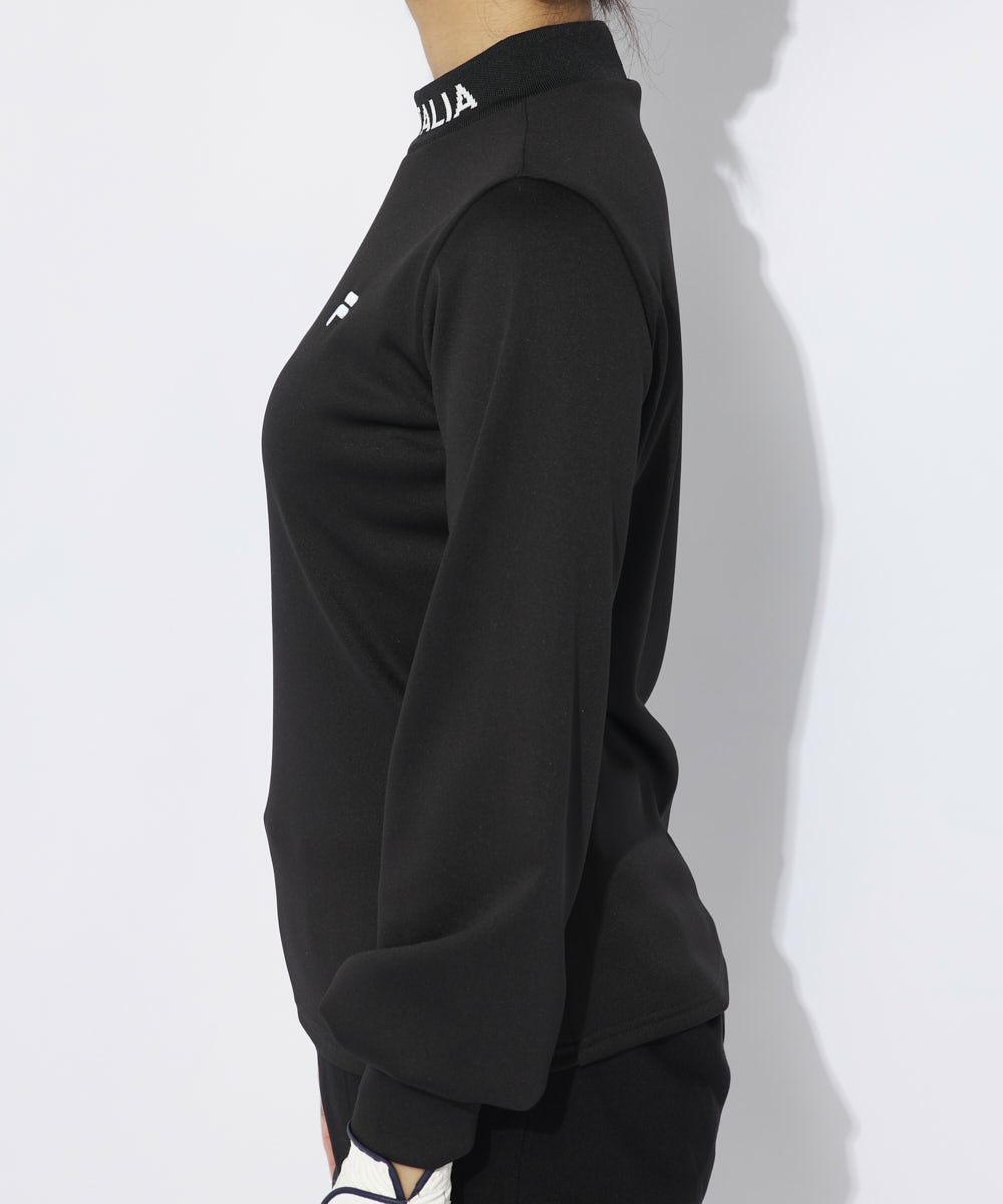 ジャガードのリブ衿がポイントのモックネックシャツ。袖口をふんわりさせたフェミニンなデザイン。裏面がベロア調の柔らかく肌触りの良いストレッチ素材を使用。袖口のボリュームは程よいボリューム感なので、インナーとしてもご利用いただけます。