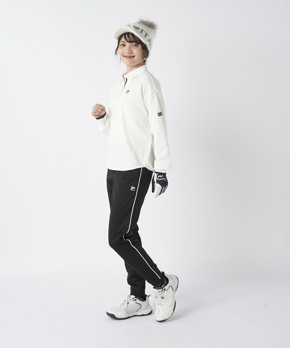 編地で表現されたロゴ柄が、シンプルになりすぎず、おしゃれなアクセントをプラスします。後ろ裾のギャザーデザインがシルエットに女性らしい丸みを加え、緩やかなラウンドヘムが柔らかな印象を演出。袖口のリブデザインもスポーティなポイントとなり、大人のクリーンなゴルフスタイルを完成させます。
