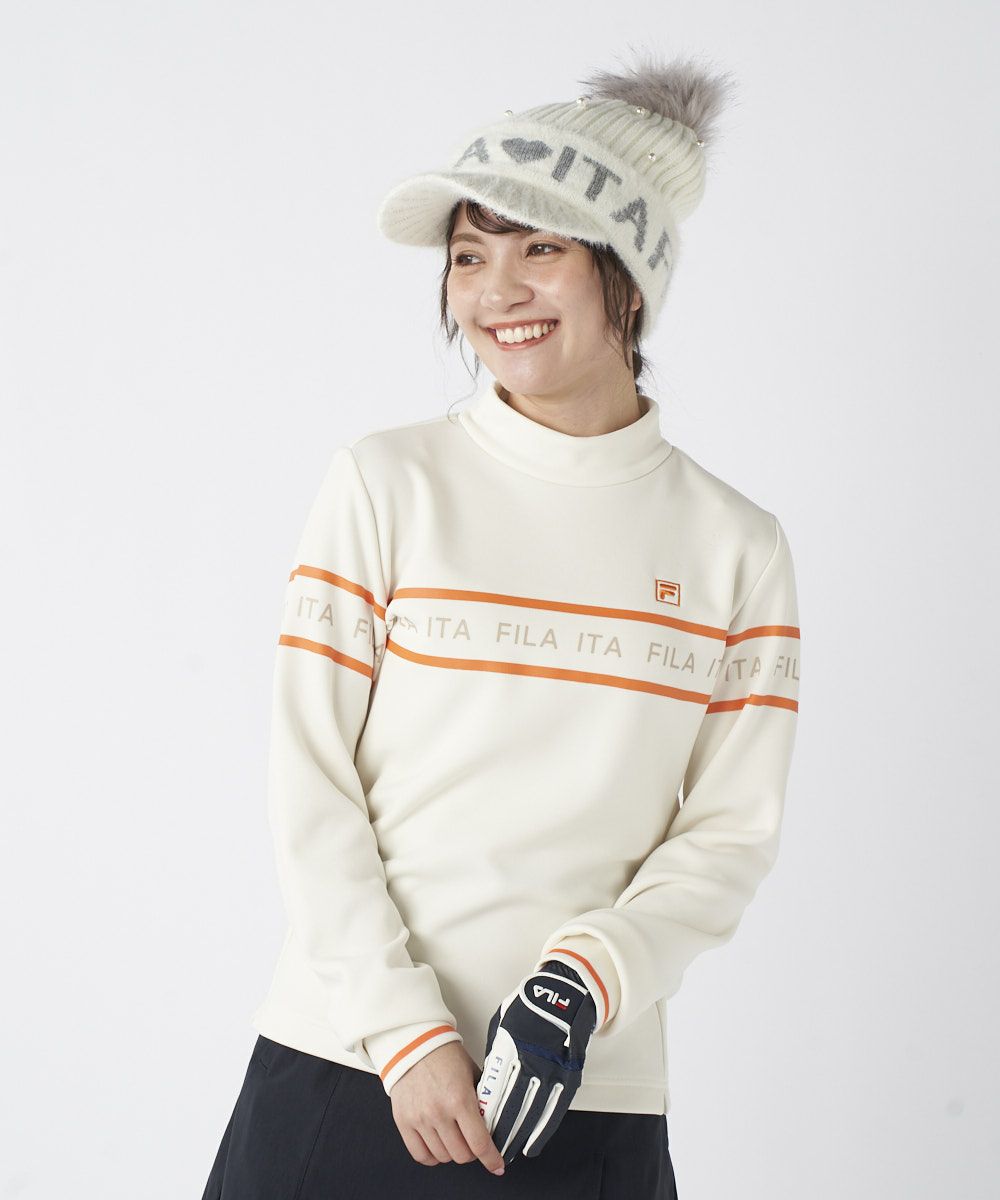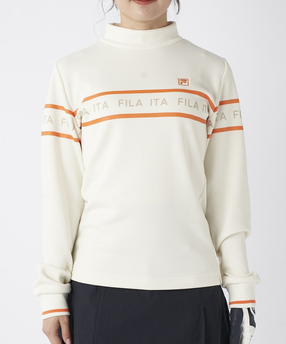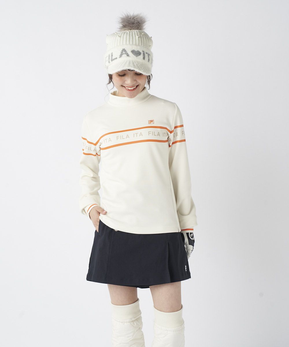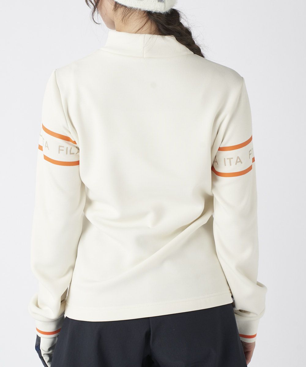 モックネックと袖口のリブ仕様がスポーティで洗練された印象を与えます。フロントの配色ライン使いのロゴプリントが、程よいアクセントとなり、ベストやブルゾンとのレイヤードもスマートに決まります。シンプルかつ機能的で、大人の女性のクリーンなゴルフスタイルに欠かせないベーシックアイテムです。
