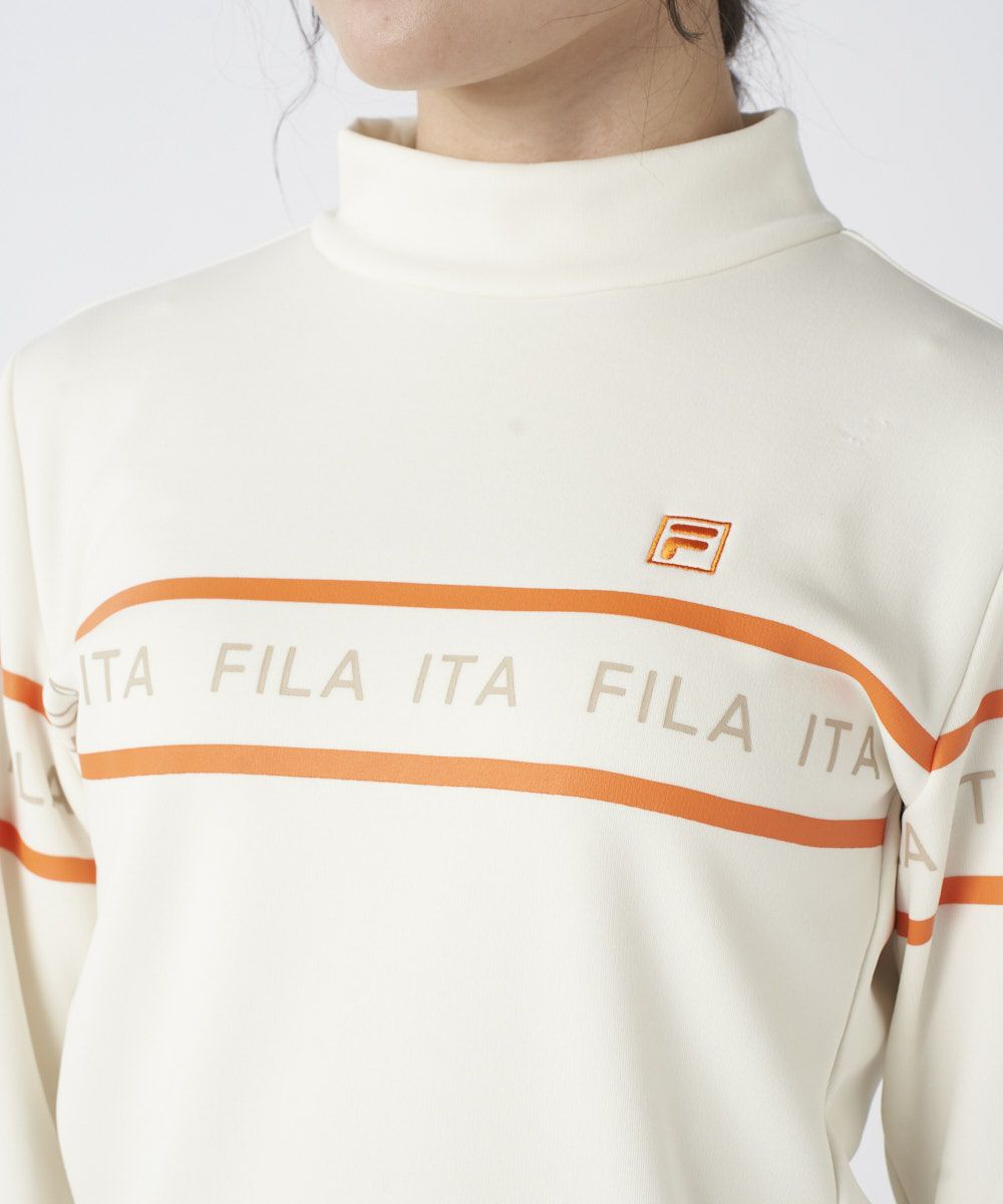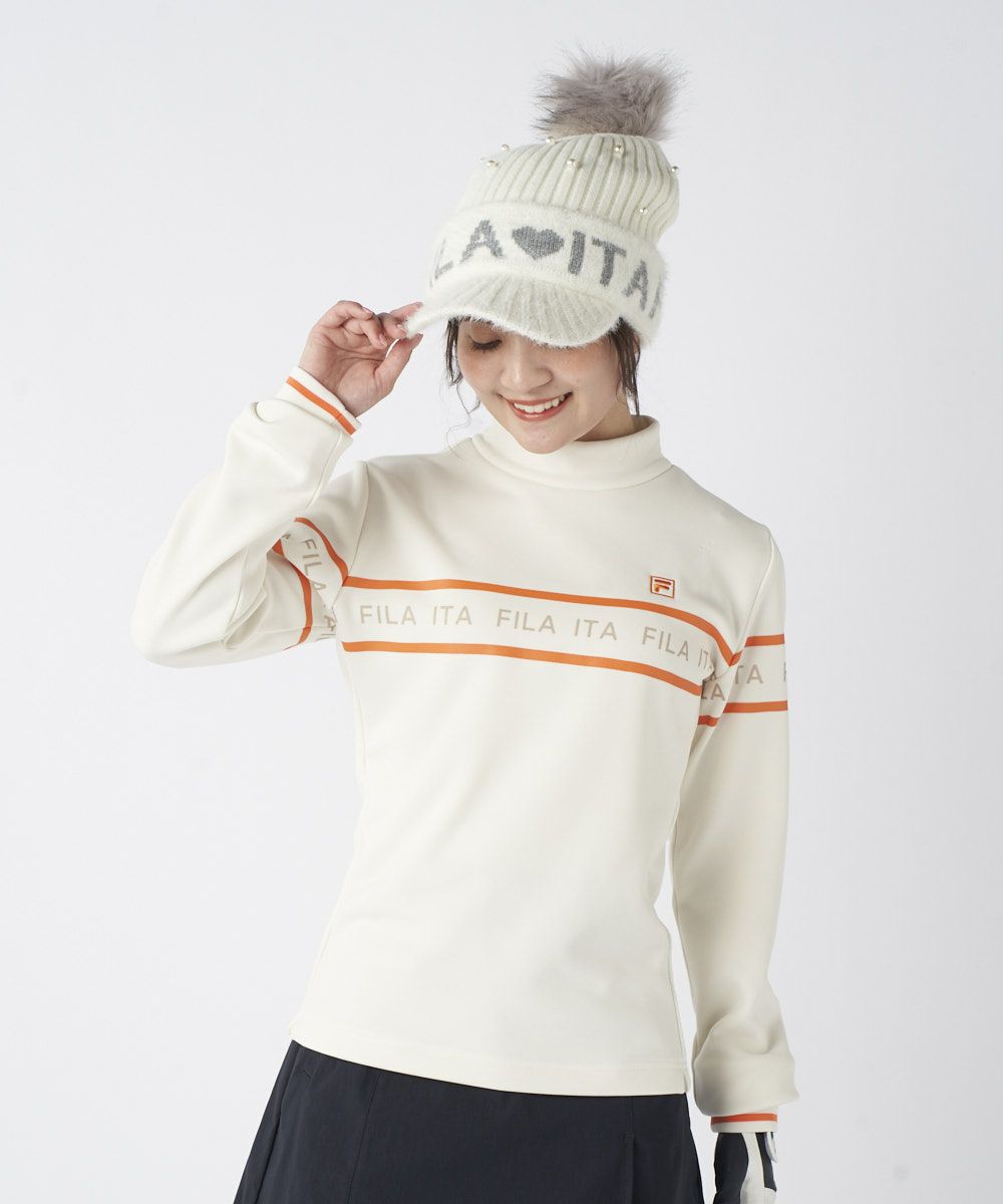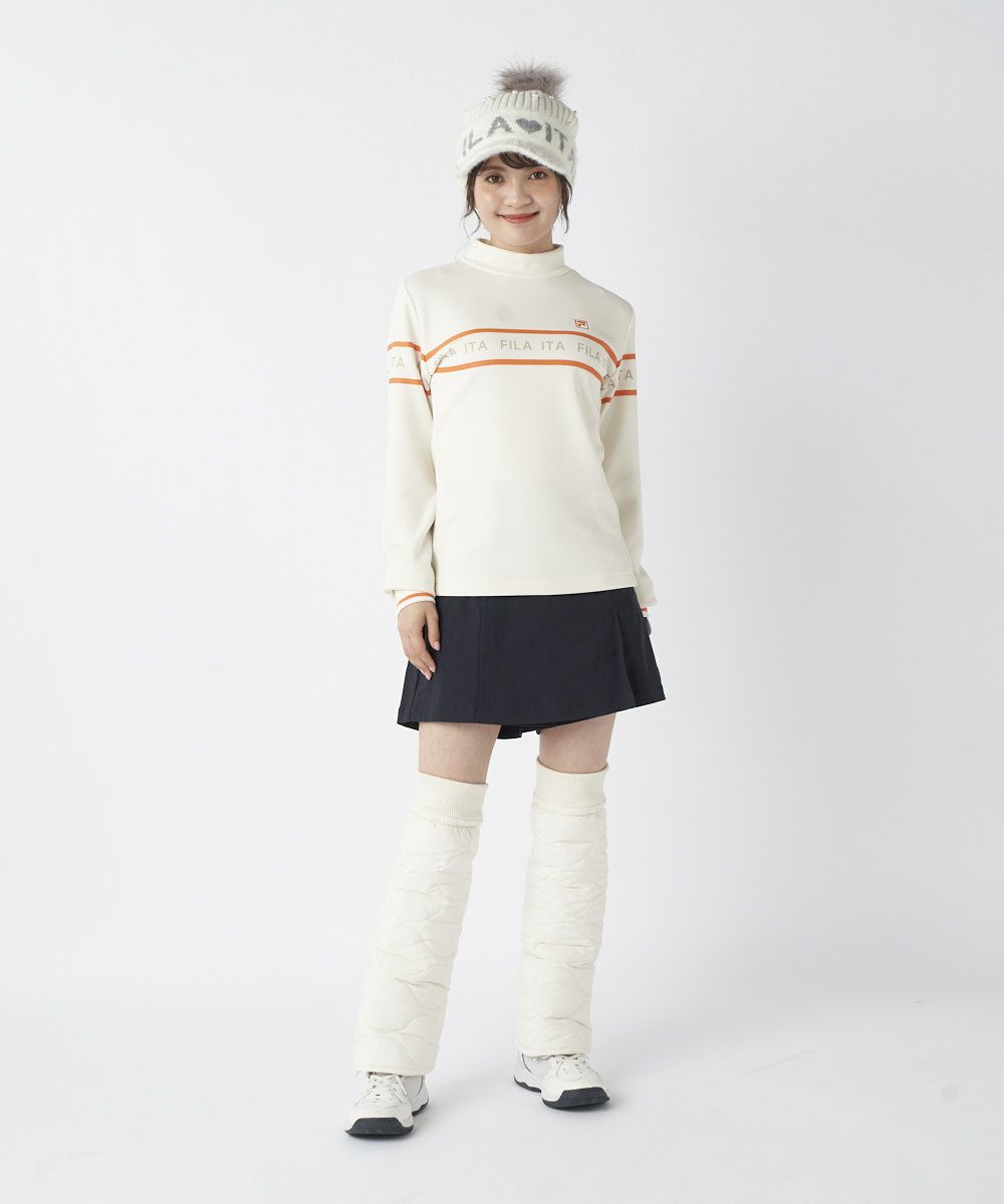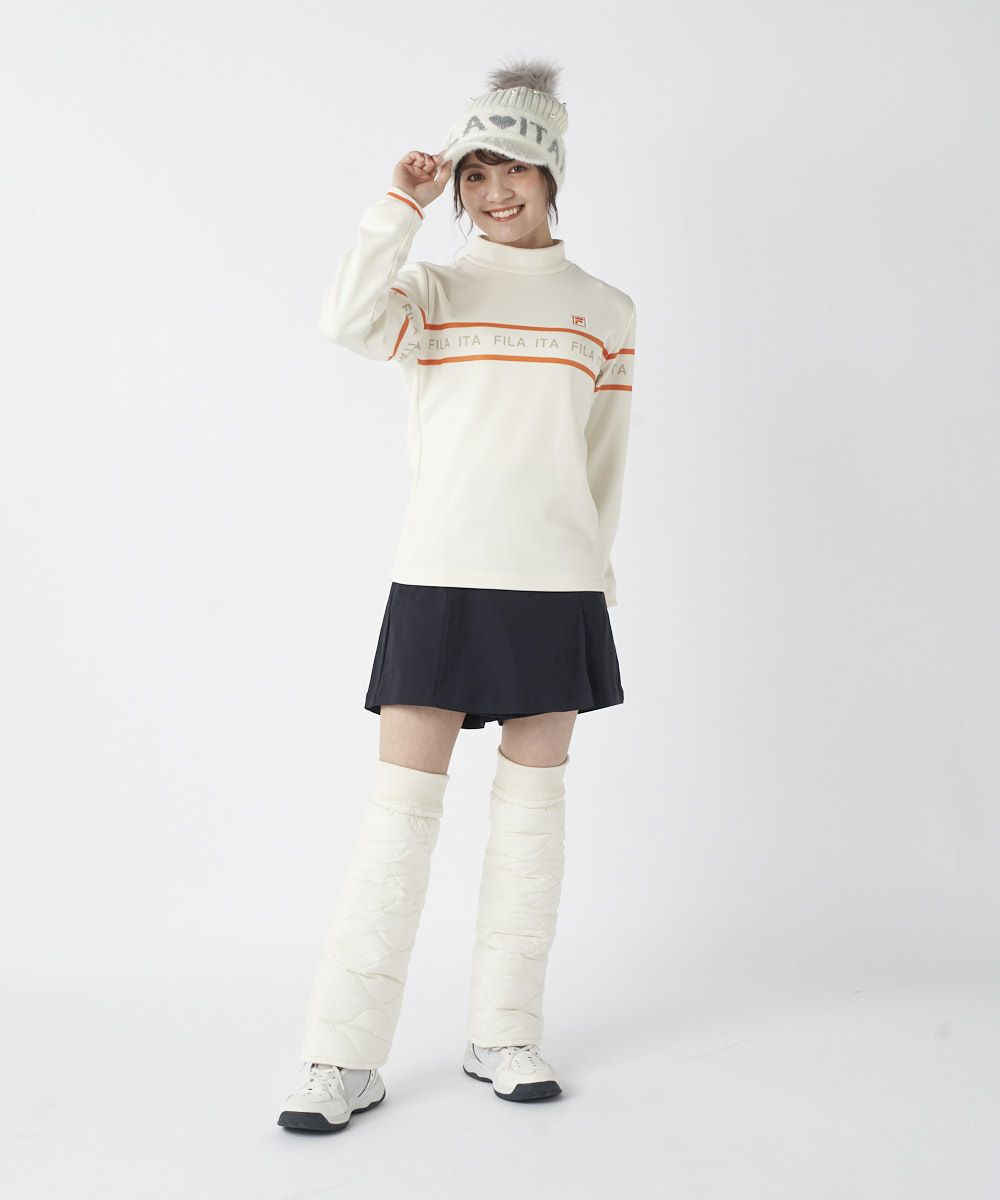 モックネックと袖口のリブ仕様がスポーティで洗練された印象を与えます。フロントの配色ライン使いのロゴプリントが、程よいアクセントとなり、ベストやブルゾンとのレイヤードもスマートに決まります。シンプルかつ機能的で、大人の女性のクリーンなゴルフスタイルに欠かせないベーシックアイテムです。