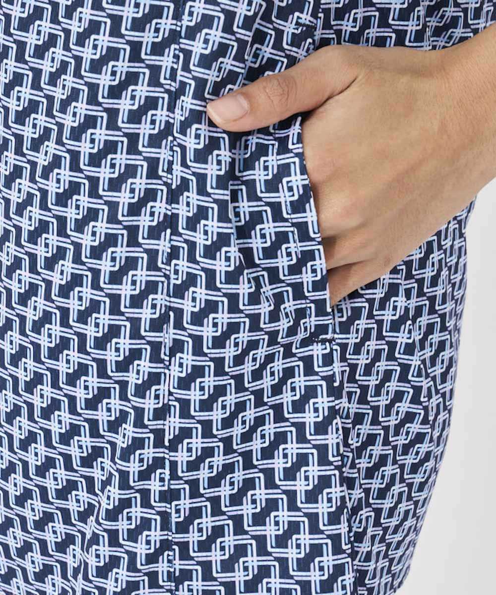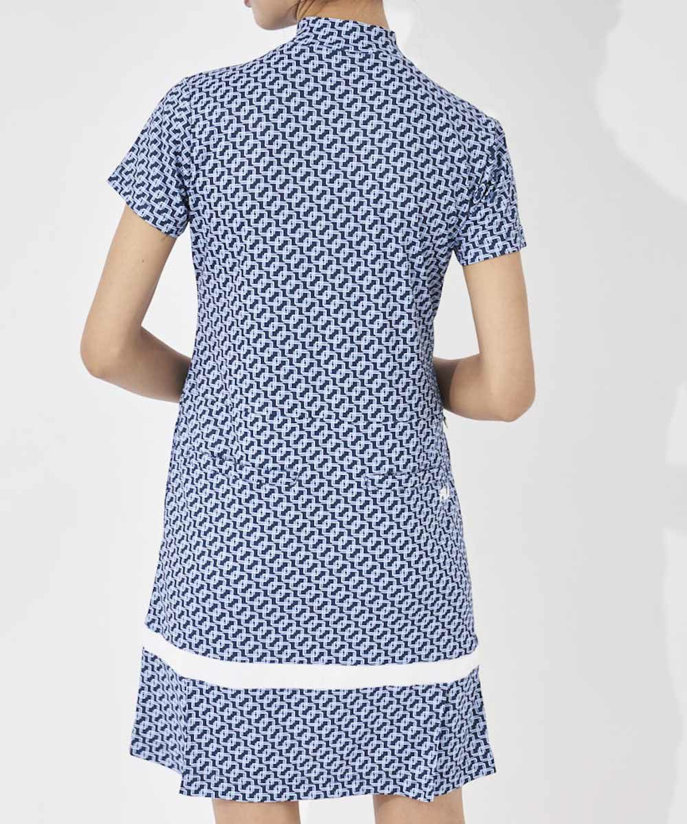 レトロな小つき柄をスポーティなデザインに落とし込んだ、変形モックネックのワンピース。スカート裾にプリーツを取り入れ、かわいらしいイメージをプラスしました。接触冷感、吸汗速乾でいつでもサラッとした着心地、さらにUVカットも備えた機能性素材なので、夏のゴルフも快適にプレーしていただけます。