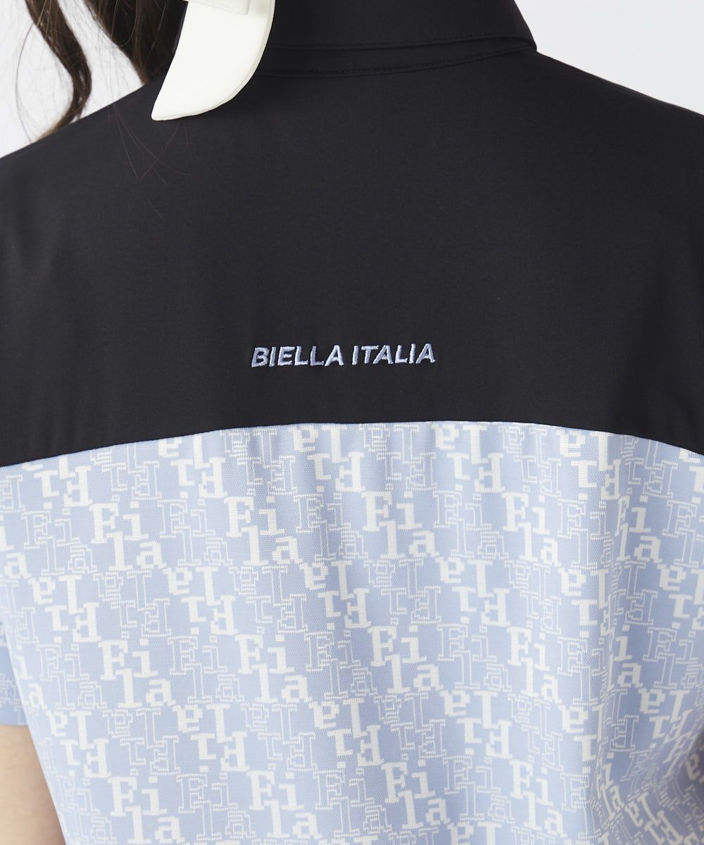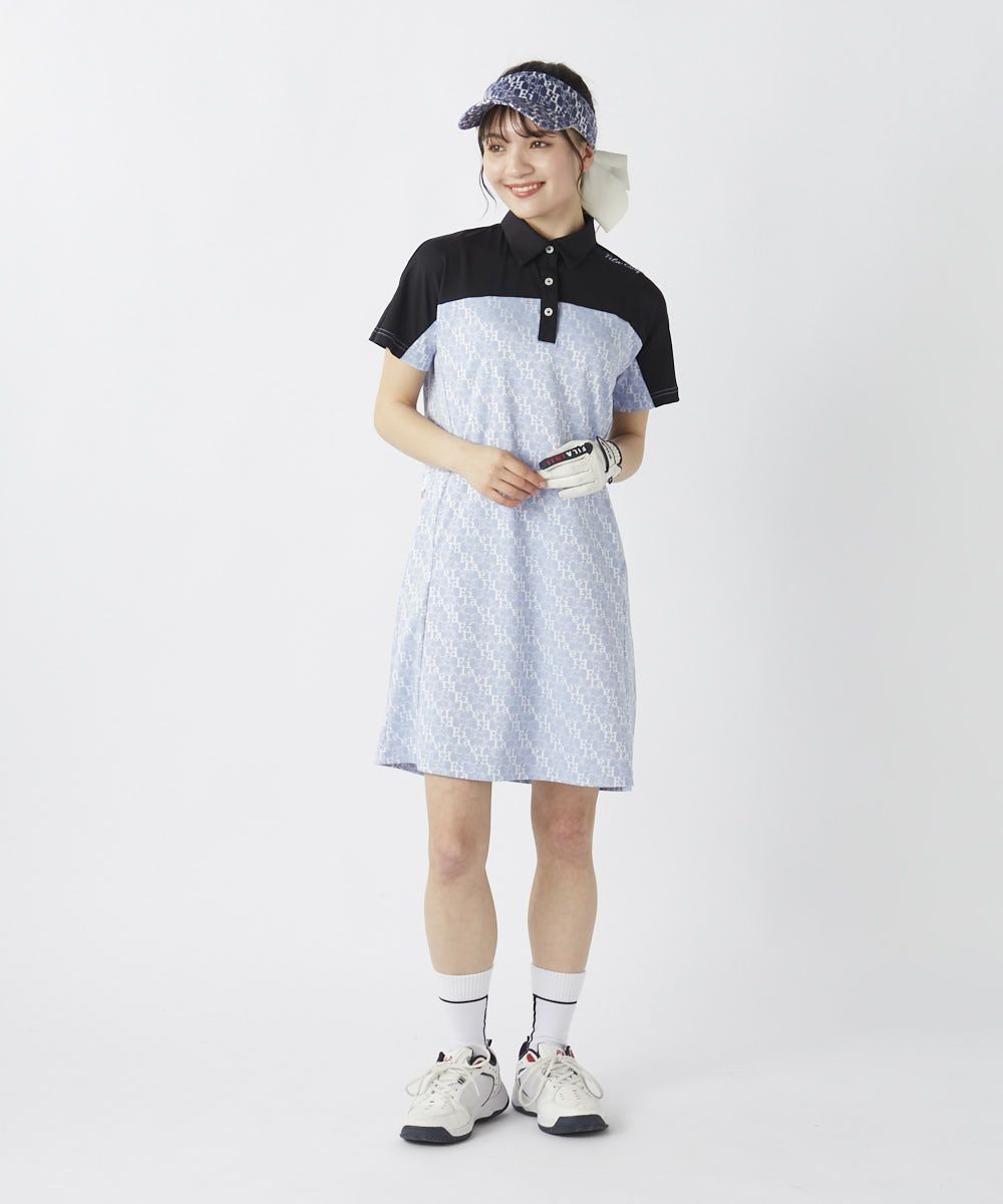 襟と袖部分はホワイトで切り替えられ、クラシックなポロシャツ風のディテールがゴルフシーンにぴったり!