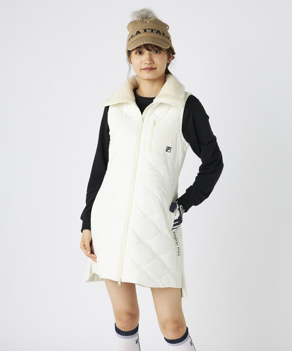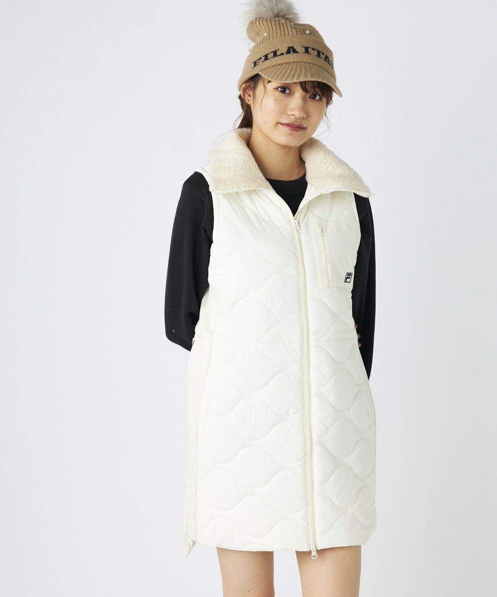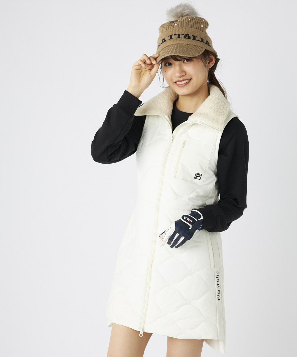 柔らかなキルト加工が上品な印象を演出し、衿元のボアが優しく可愛らしいアクセントを添えます。フルジップ仕様で着脱もスムーズ。ウエストは内側のスピンドルで調整可能なため、好みのシルエットでスタイルアップ効果も期待できます。