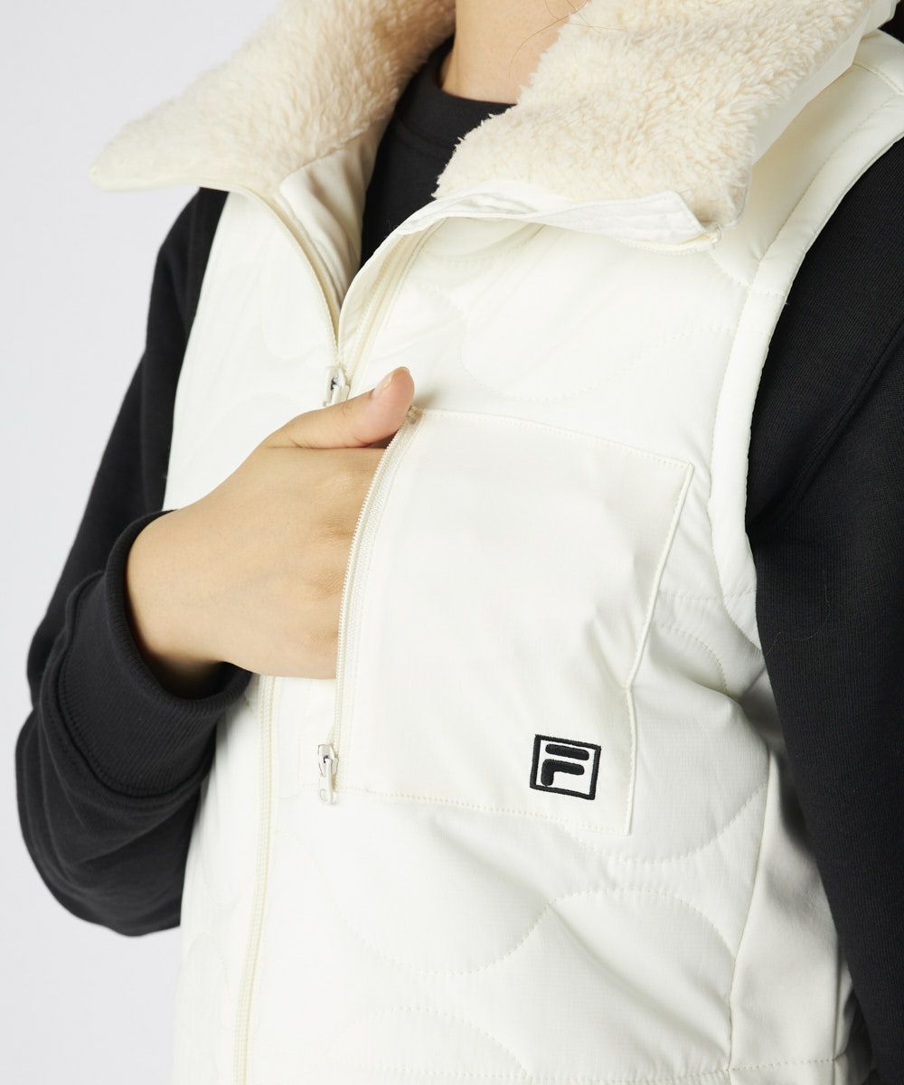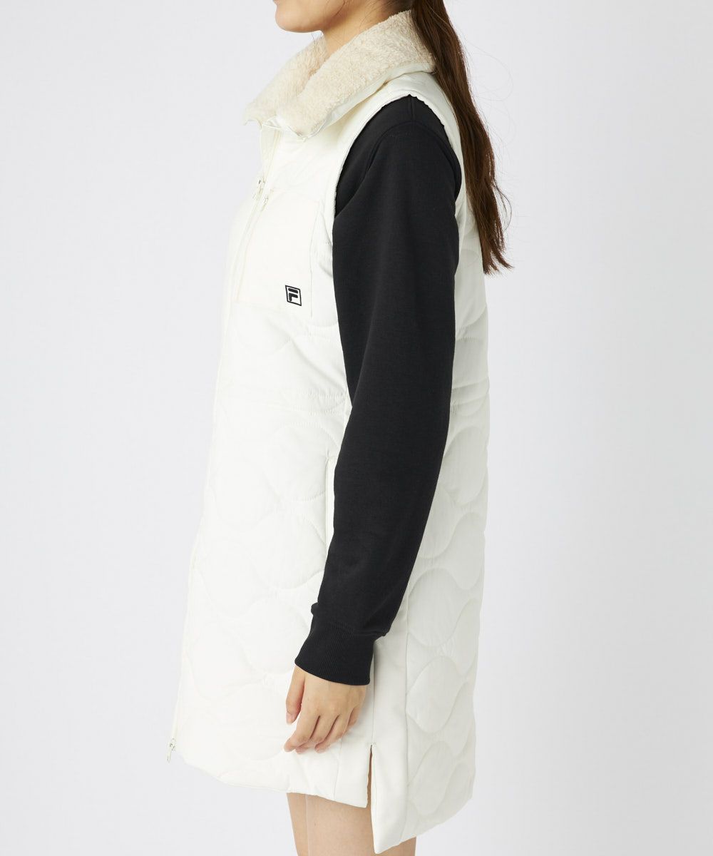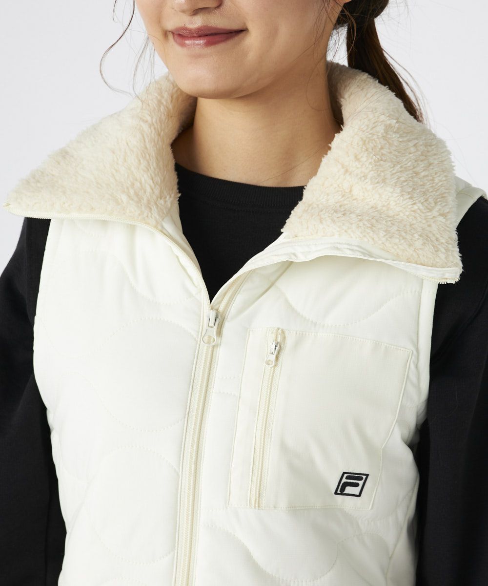 柔らかなキルト加工が上品な印象を演出し、衿元のボアが優しく可愛らしいアクセントを添えます。フルジップ仕様で着脱もスムーズ。ウエストは内側のスピンドルで調整可能なため、好みのシルエットでスタイルアップ効果も期待できます。