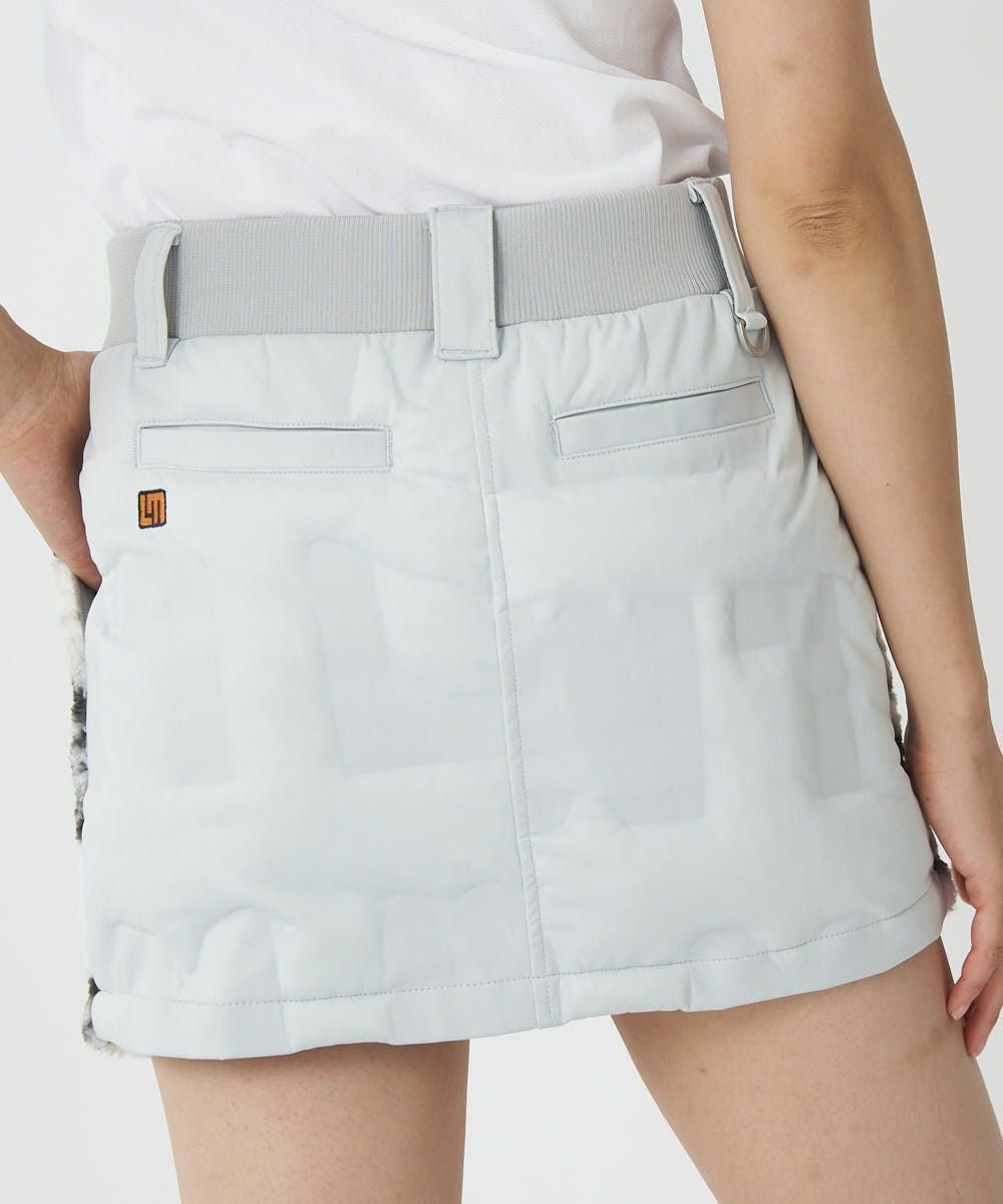 前身はオリジナル柄のストレッチボアフリース素材、後身は圧着加工裏地蓄熱フィルム中綿のLMロゴキルト素材となっています。 見る方向によって変化を楽しめるデザインスカート。