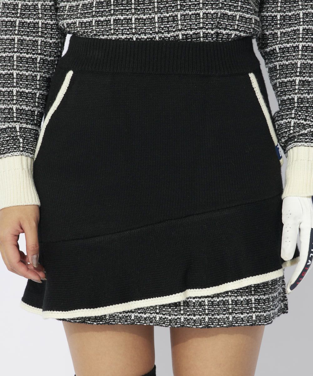 裾のツイードライクな編地がアクセントになった、ラッフル使いが大人かわいいニットスカート。同素材のセー ターとのセットアップコーデがおすすめです。