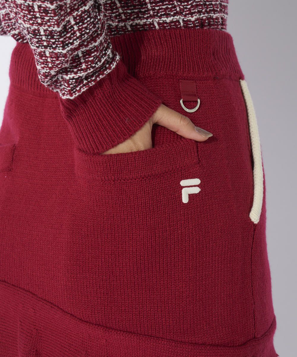 裾のツイードライクな編地がアクセントになった、ラッフル使いが大人かわいいニットスカート。同素材のセー ターとのセットアップコーデがおすすめです。