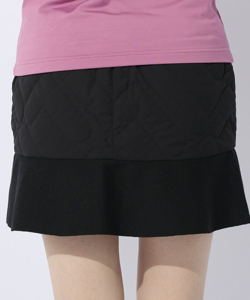 タフタとニットを組み合わせた異素材ミックスのスカートで、身頃部分は中綿+蓄熱裏地で保温性を高めました 。 身頃にはFをモチーフにしたキルトを採用しています。