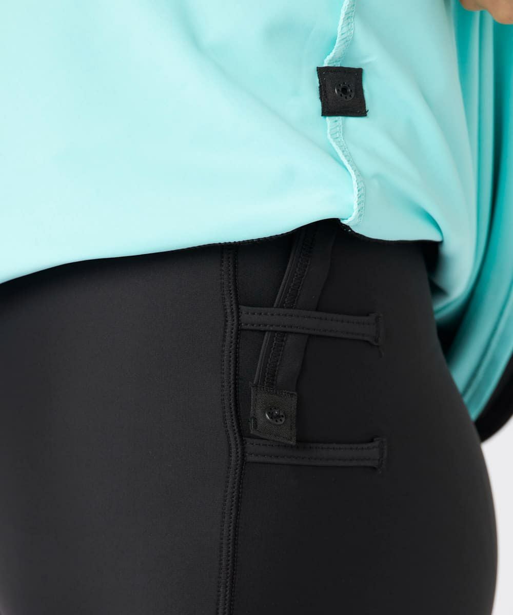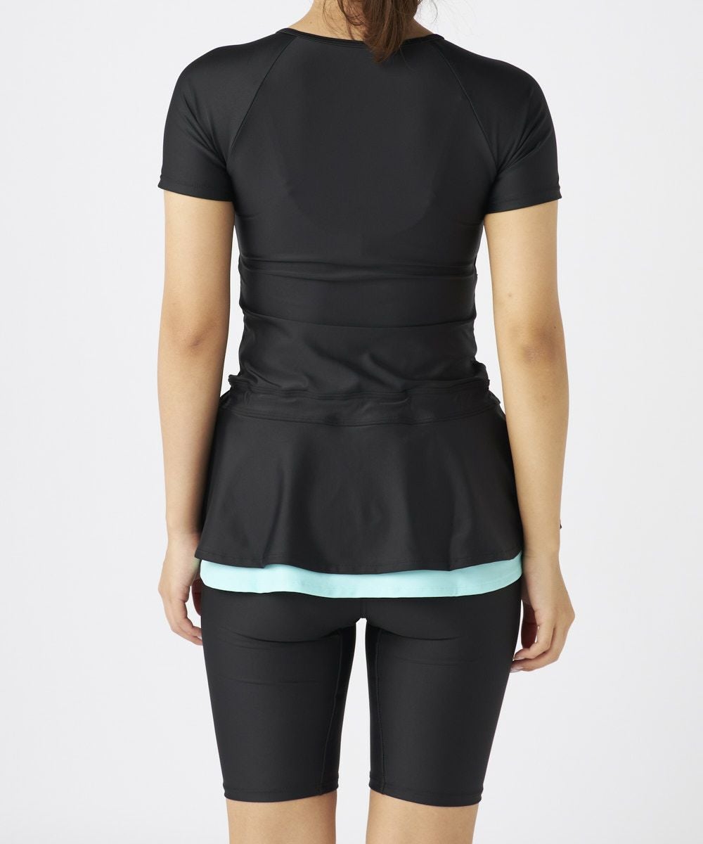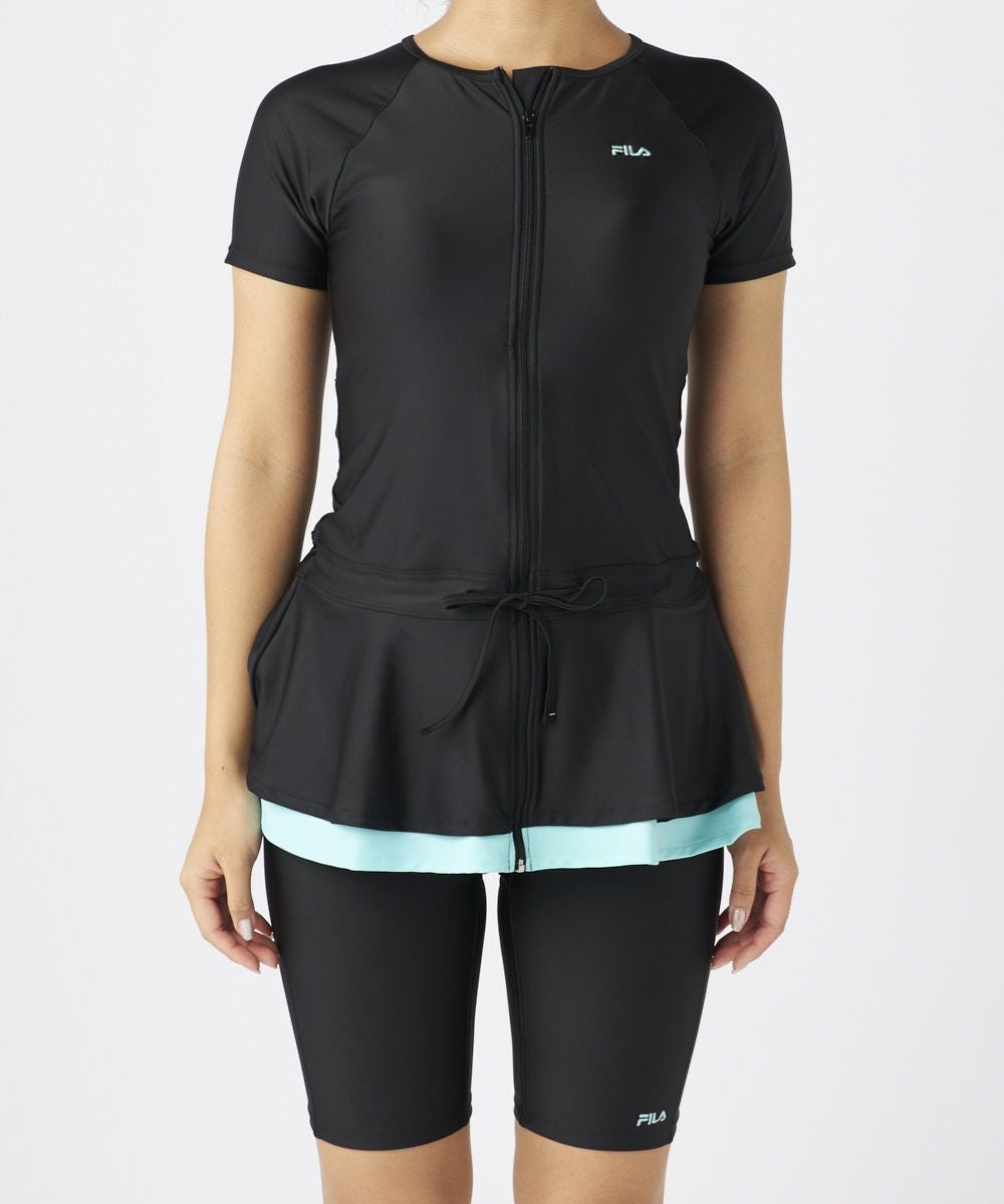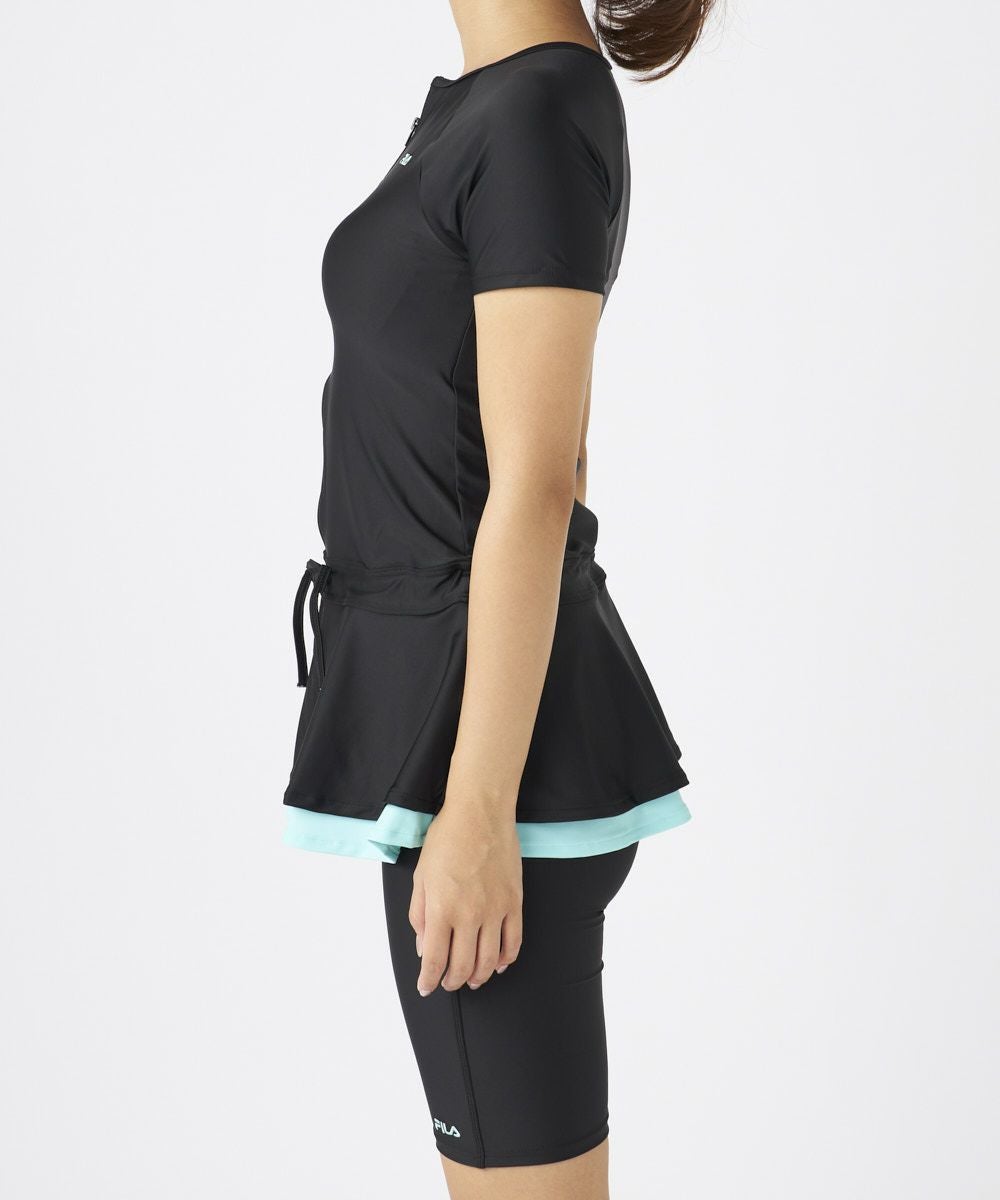 理想の体型カバーが叶うチュニックタイプのFILAフィットネス水着。半袖タイプで気になるに二の腕 をしっかりカバー。チュニックタイプで丈長なので一番気になるヒップもしっかりカバーできる最強 の体系カバーシリーズ。無地でシンプルなデザインですが裾がカラー切り替えのフリルがおしゃれポ イントに。かわいすぎず大人なおしゃれを演出します。またフリルのデザインはウエストを細く見せ 全体的にスッキリな印象。チュニックタイプでもしっかりスナップボタンタイプのめくれ防止機能付きで安心。