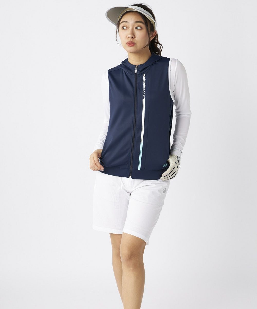 ベーシックカラーでコーディネート力抜群のフーディーベスト。ソフトで超軽量ながらハリ感のある接触冷感 機能付き段ボールニット!脇切り替えがきれいなボディーラインを演出。