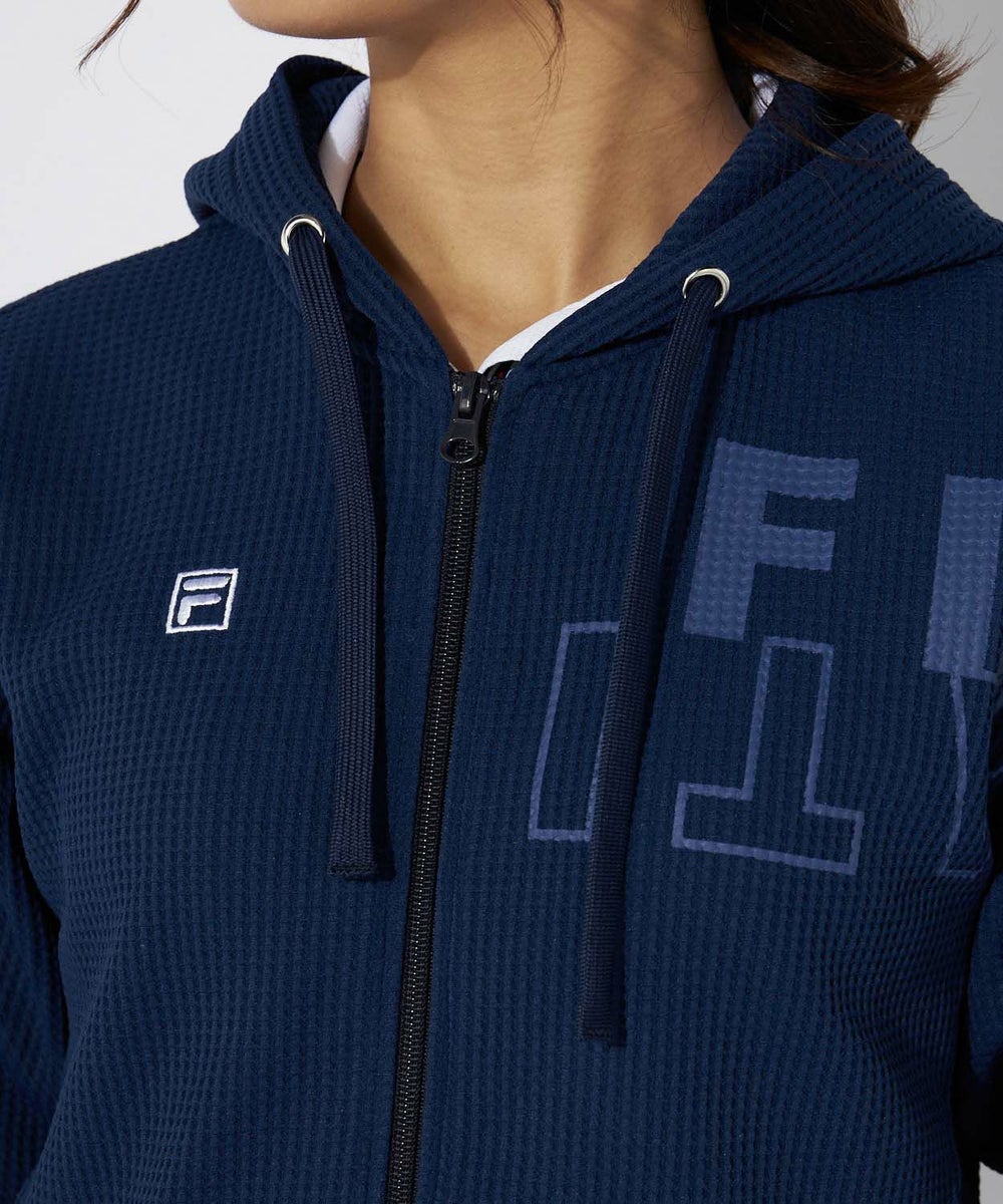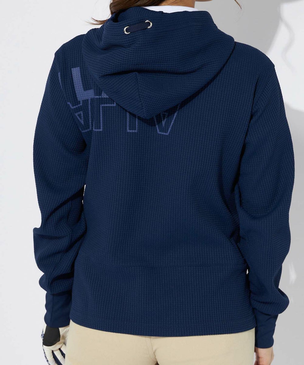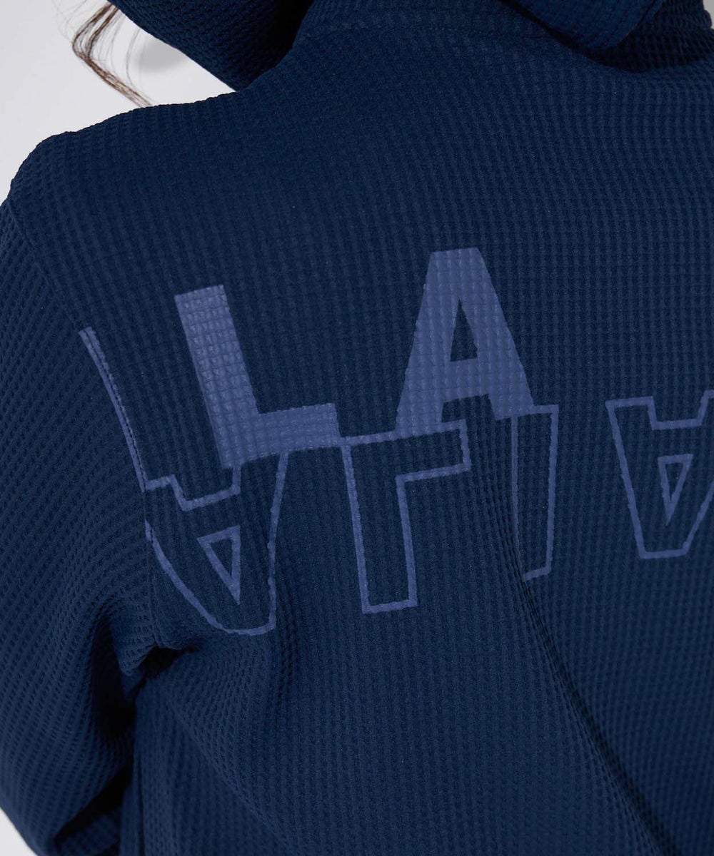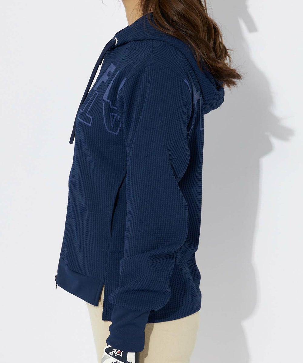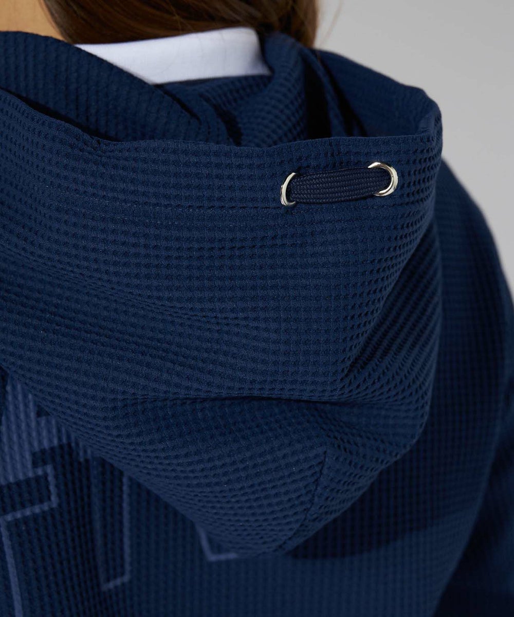 寒暖差のある春先から活躍する、表面感のあるワッフル素材を使用したパーカー。裾にスリットと前後差をつけた。動きのあるシルエットです。