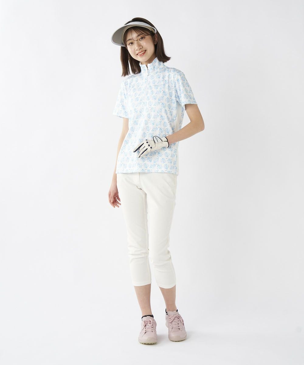 デザインはさりげない小花柄が上品なハーフジップシャツです。無地のパンツやスカートとはもちろん、柄アイテムと合わせたコーディネートもおしゃれです!ハーフジップで、首もとまで隠れるので、ゴルフ中に気になる首周りの日焼け対策もばっちりできます。半分ぐらいあけて、ポロシャツの襟のようにしてもかわいいです。気分に合わせて着こなしを変えて楽しみましょう!