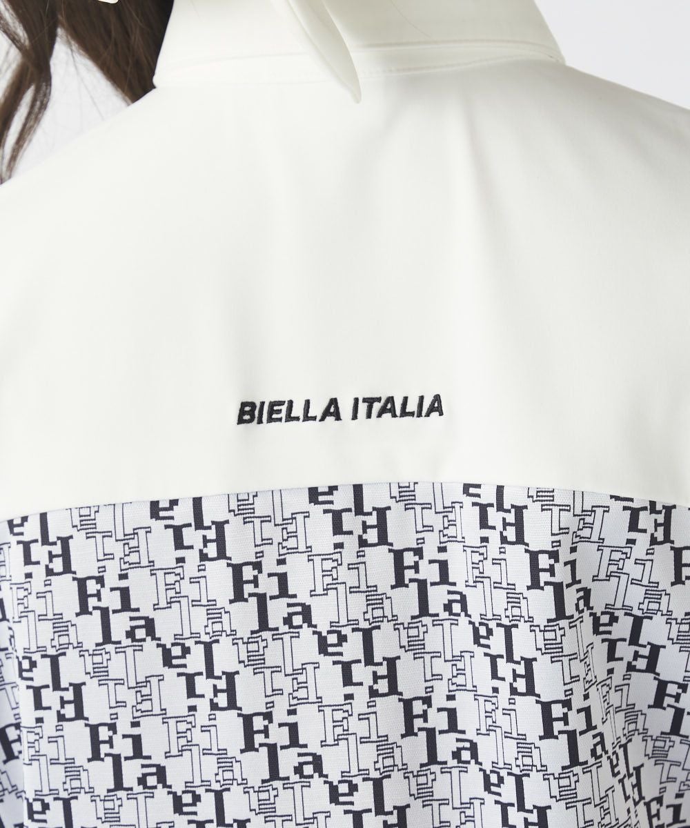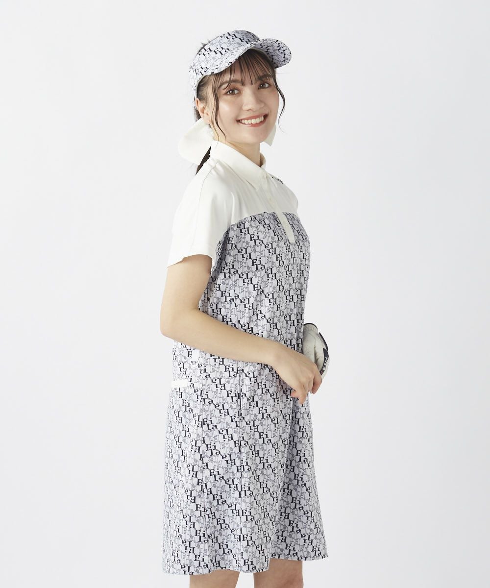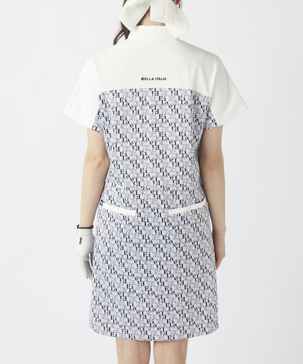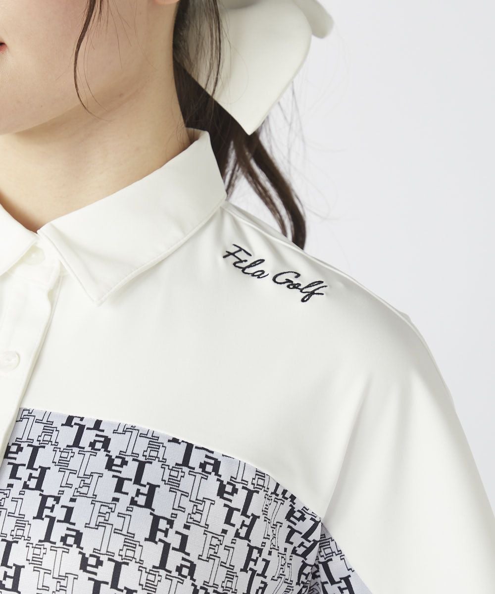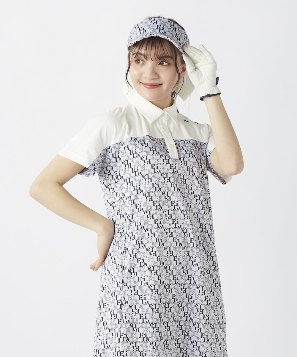 襟と袖部分はホワイトで切り替えられ、クラシックなポロシャツ風のディテールがゴルフシーンにぴったり!