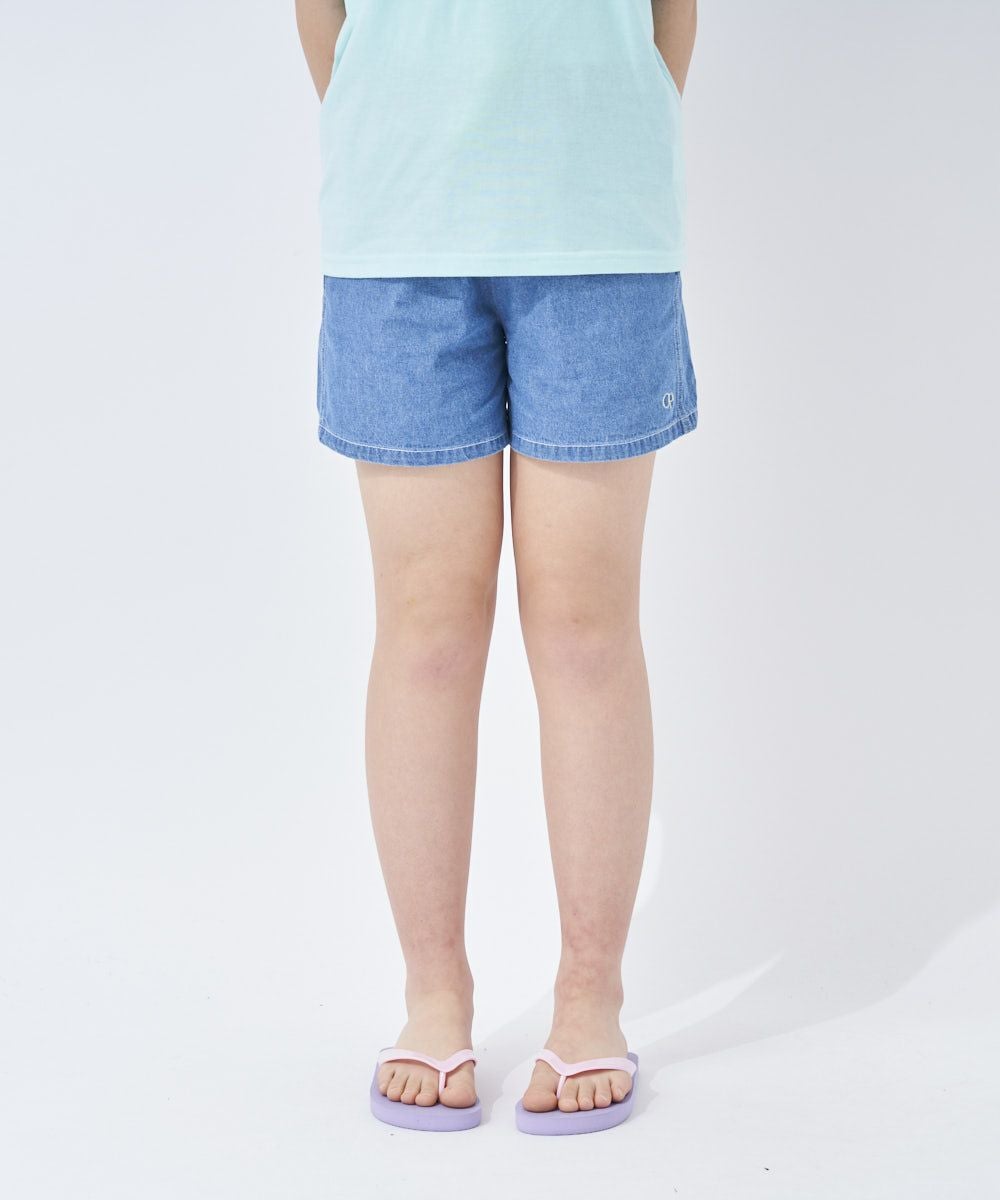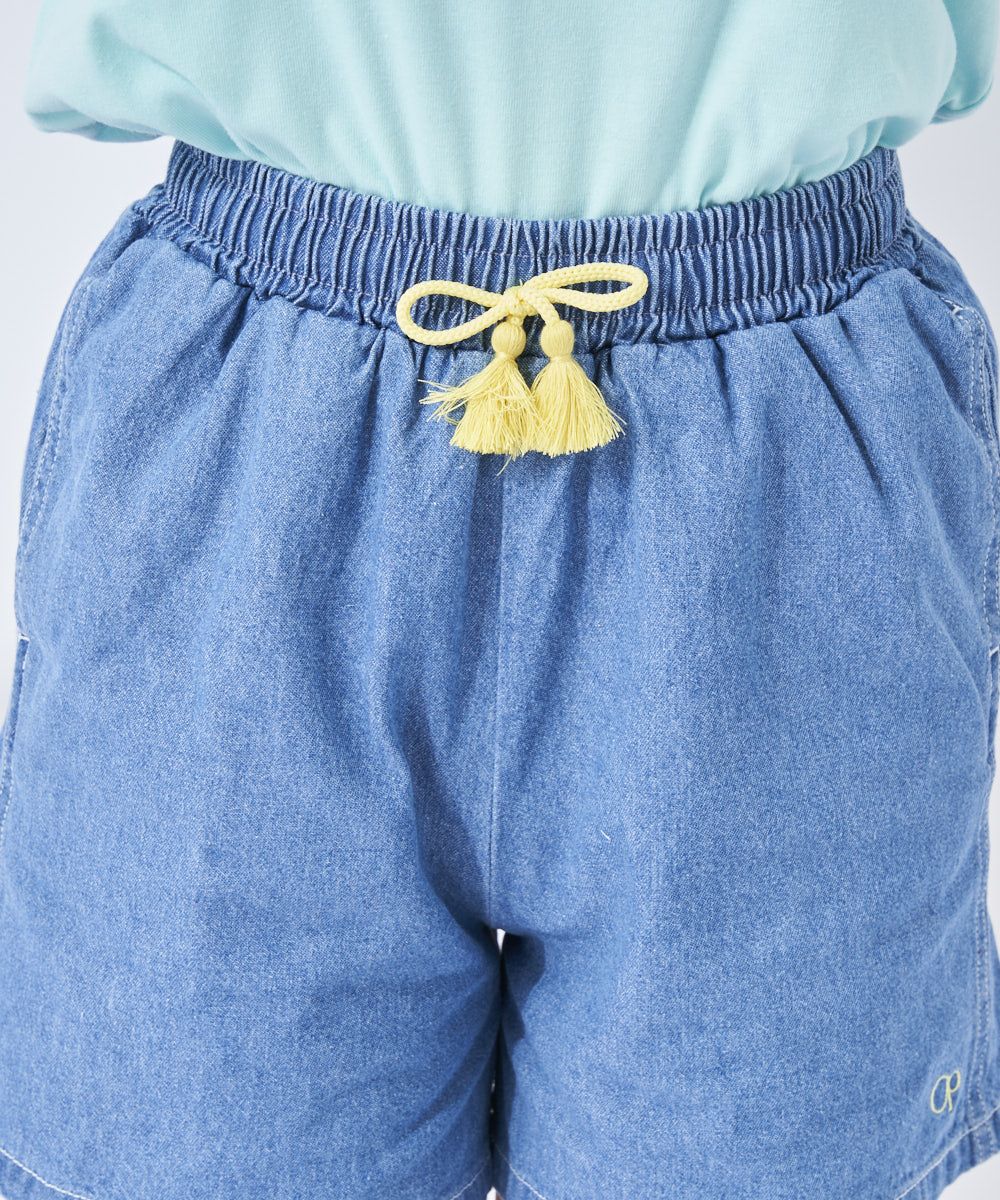 着回しやすいデニム素材のショートパンツ。ウエストに着いたタッセルリボンがポイント。